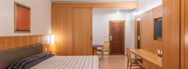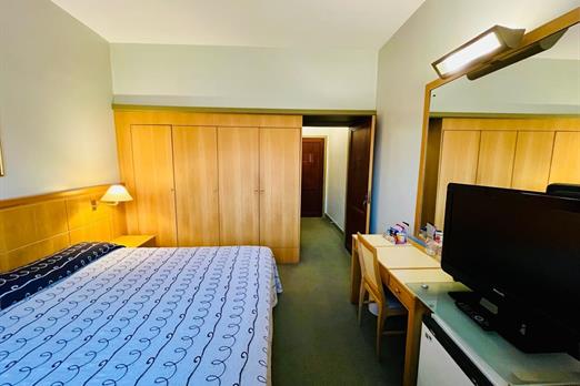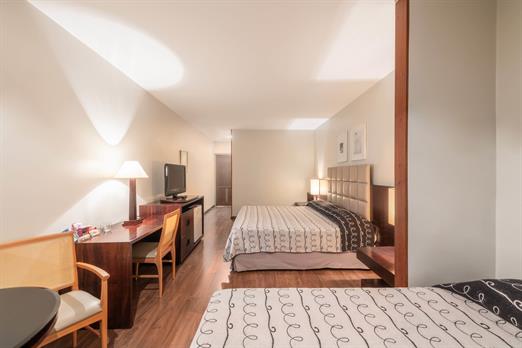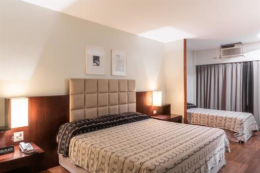 Suíte com uma cama casal king e uma cama de solteiro. Possui mesa de trabalho, wifi, tv a cabo, ar condicionado, frigobar, ducha de aquecim...