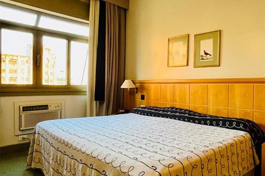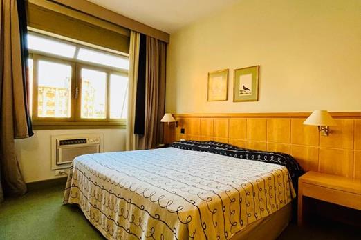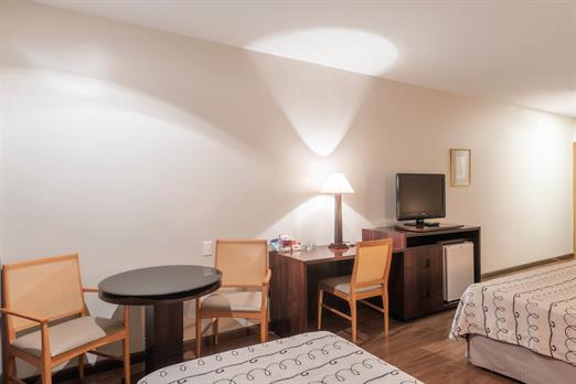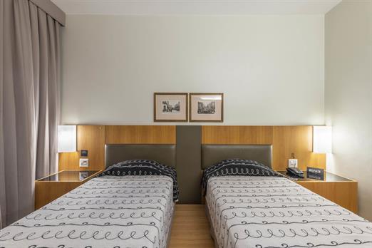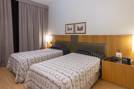 Apartamento de categoria superior com duas camas de solteiro. Possui mesa de trabalho, wifi, tv a cabo, ar condicionado, frigobar, ducha de...
