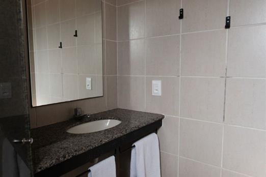 Este quarto duplo tem televisão, ar condicionado e piso de azulejo/mármore.