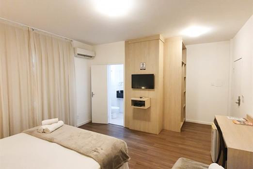 Este apartamento tem: - TV via satélite. - Ar-condicionado. - Piso frio/de mármore. - Geladeira Frigobar. - Escrivaninha de trabalho. - Cam...