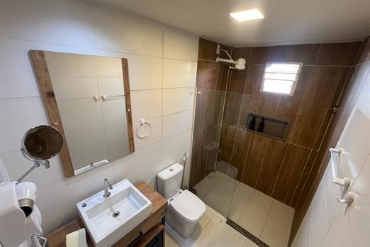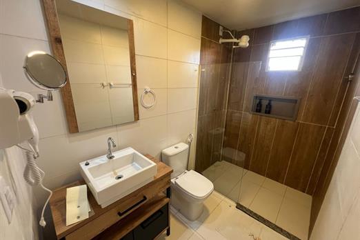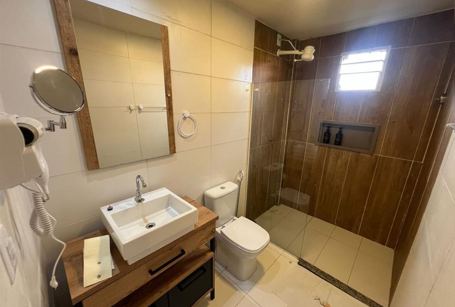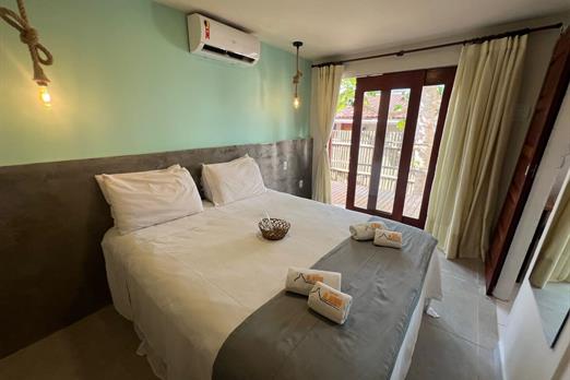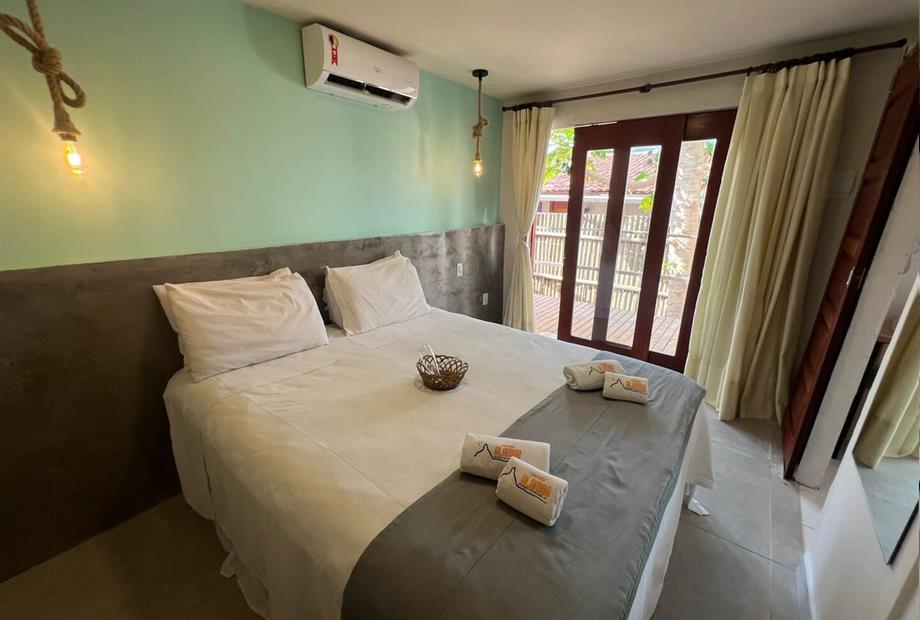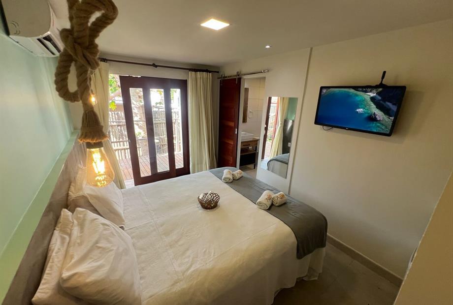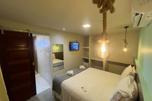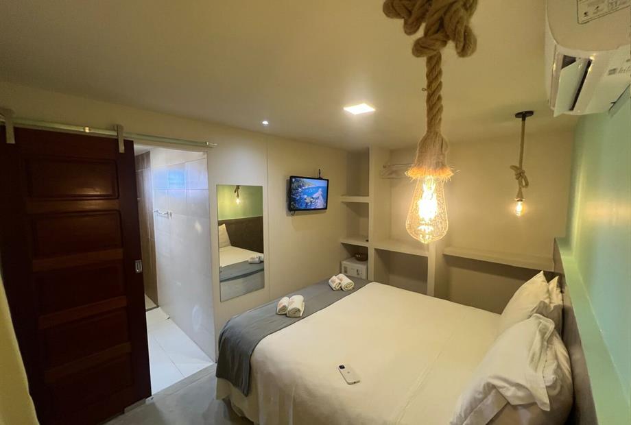 Quarto aconchegante tipo suíte que pode pode acolher até duas pessoas. Equipado com televisão, ar condicionado, frigobar, banheiro privativo...