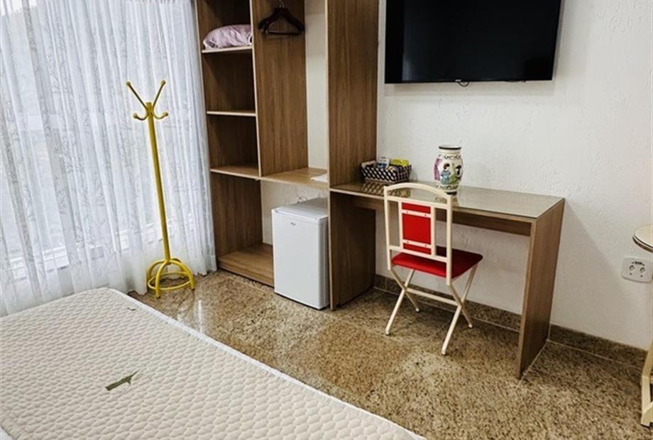 Quartos com TV Smart com canais fechados, ar-condicionado e Wi-Fi. Banheiro externo compartilhado. Configuração com uma cama queen size e u...