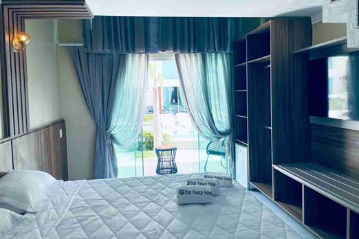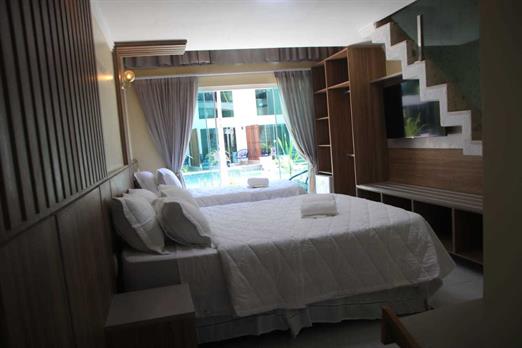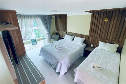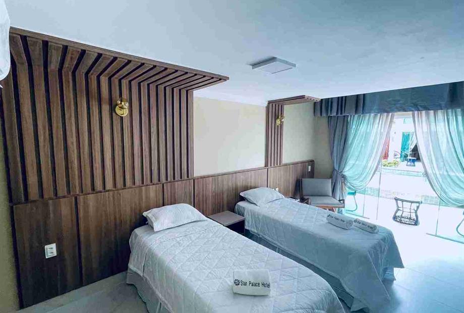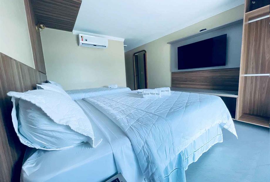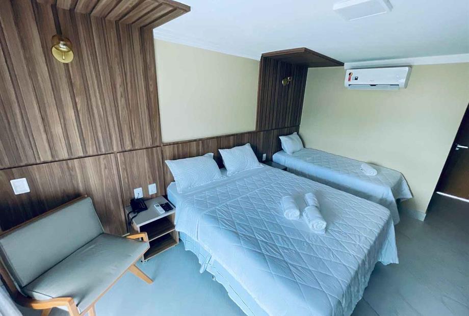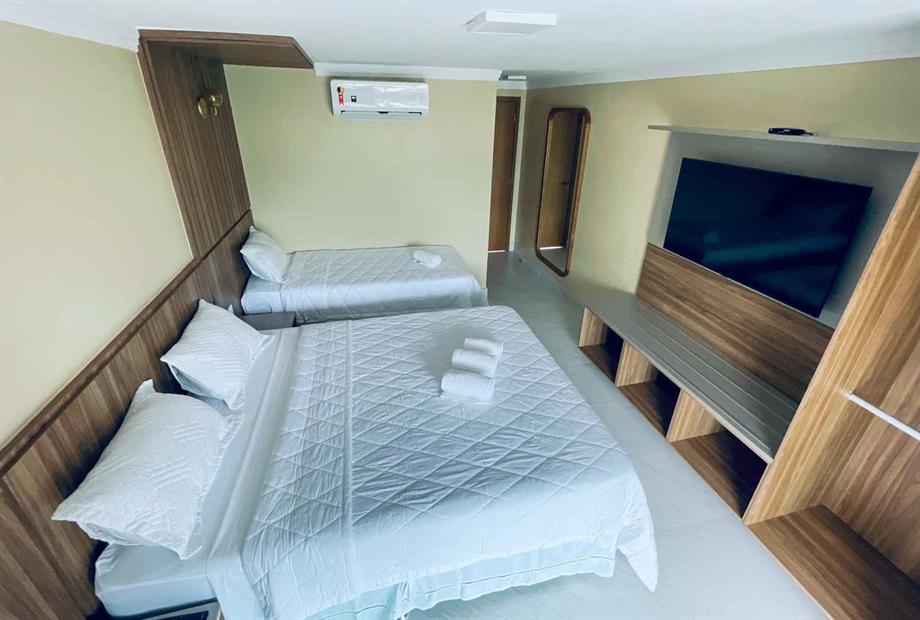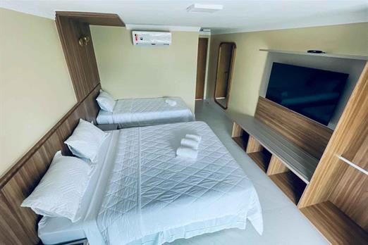 01 cama queen size e 02 camas de solteiro. Ou pode ser preparado com 02 camas queen size. Com capacidade para acomodar até 04 adultos e 01 c...