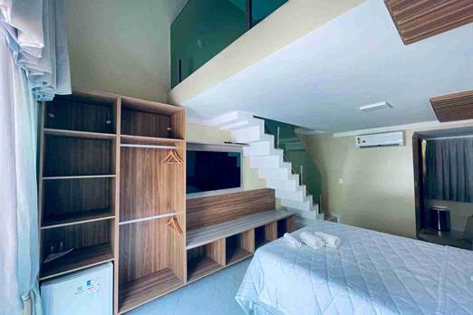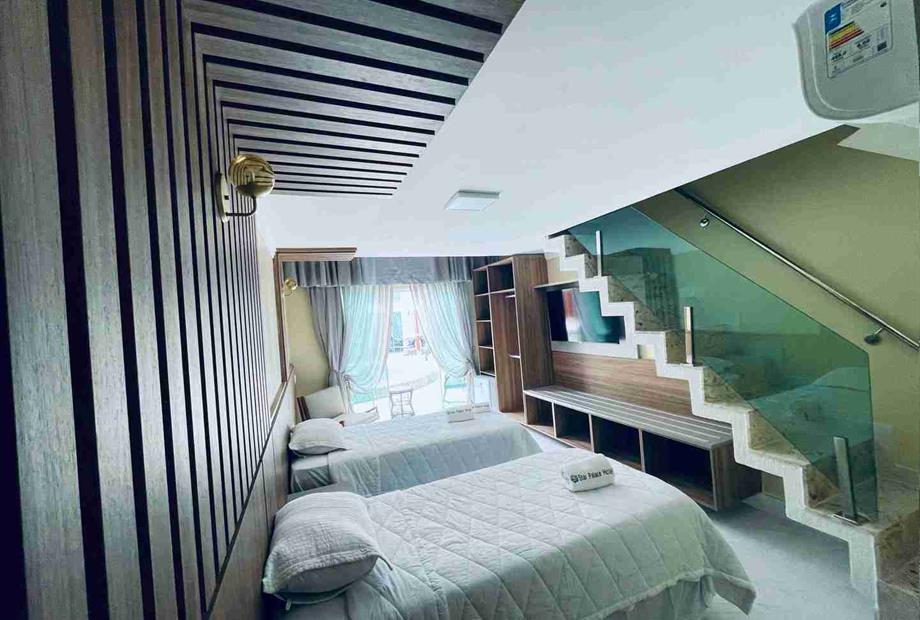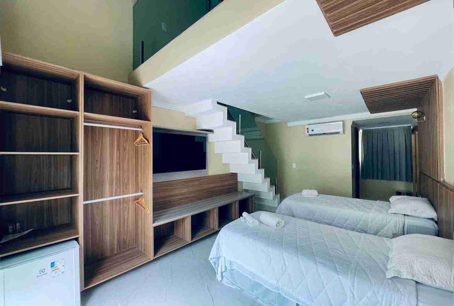 01 cama queen size e 01 cama de solteiro Com capacidade para acomodar até 03 adultos e 01 criança menor de 06 anos compartilhando a cama com...