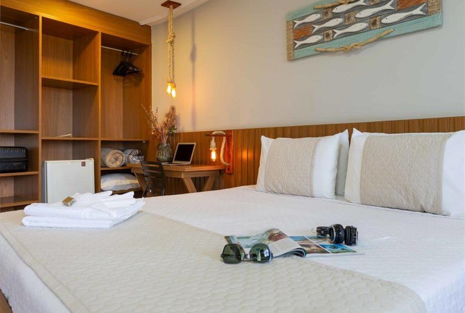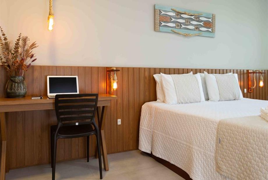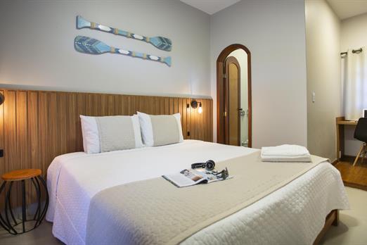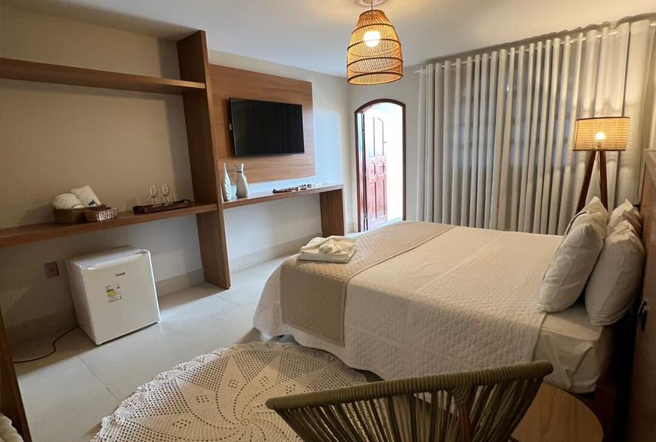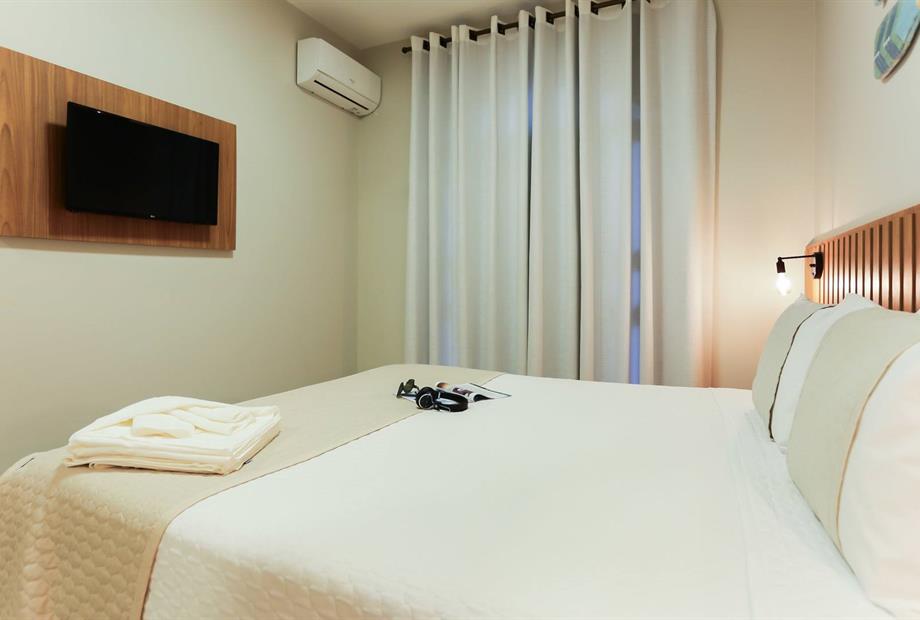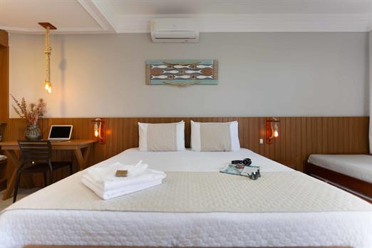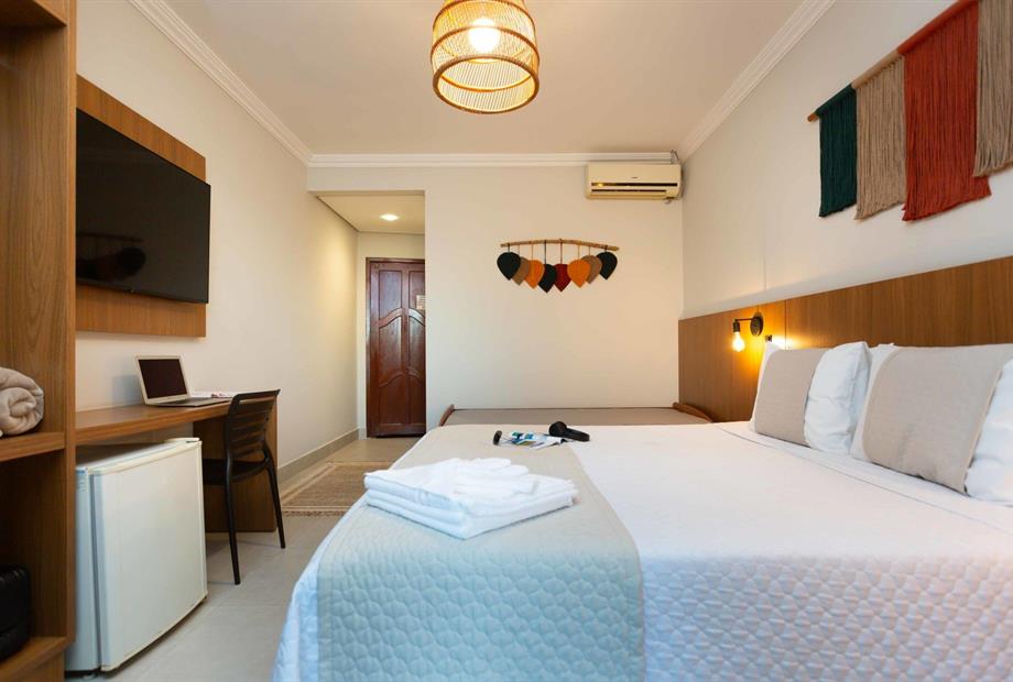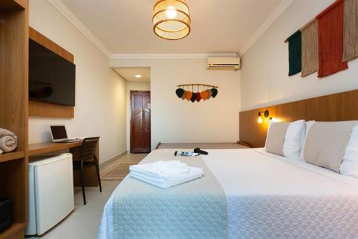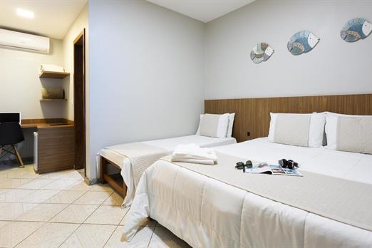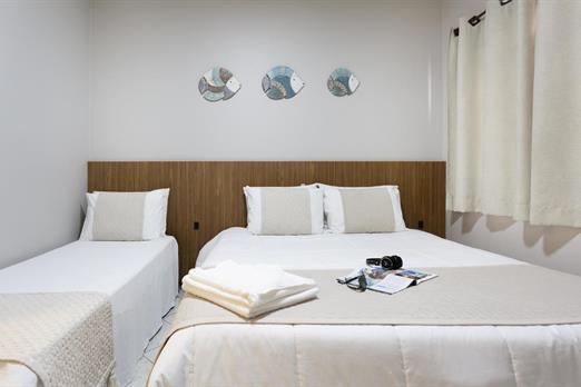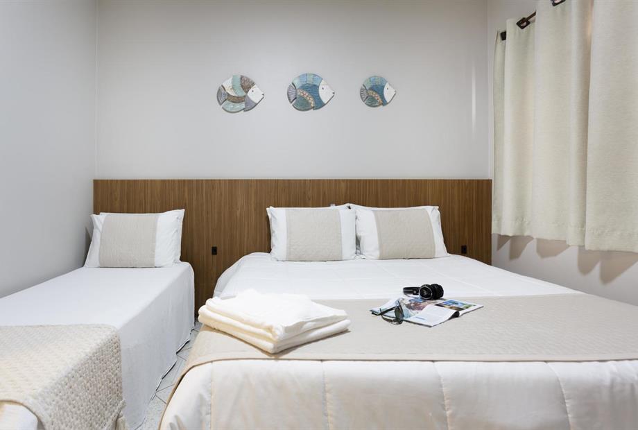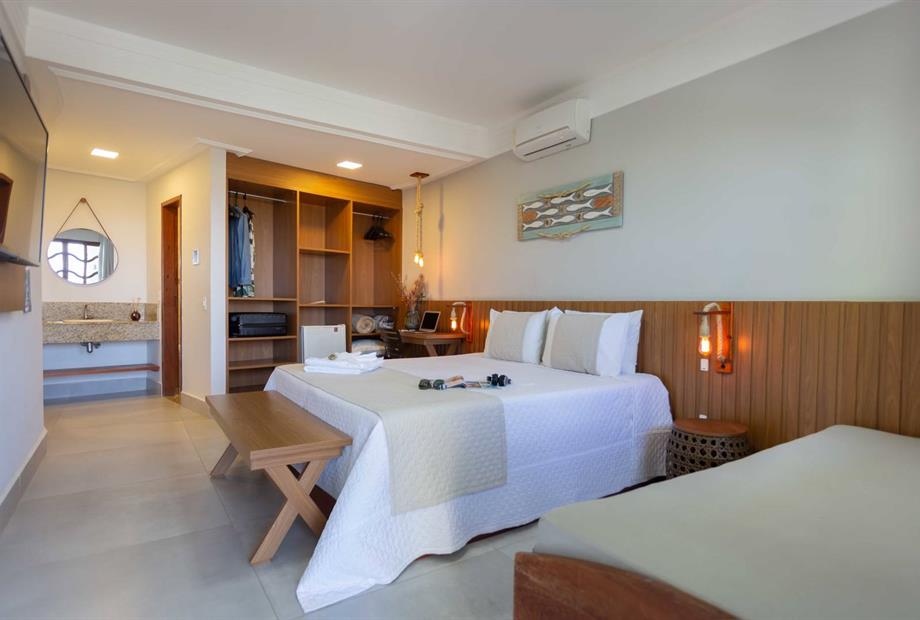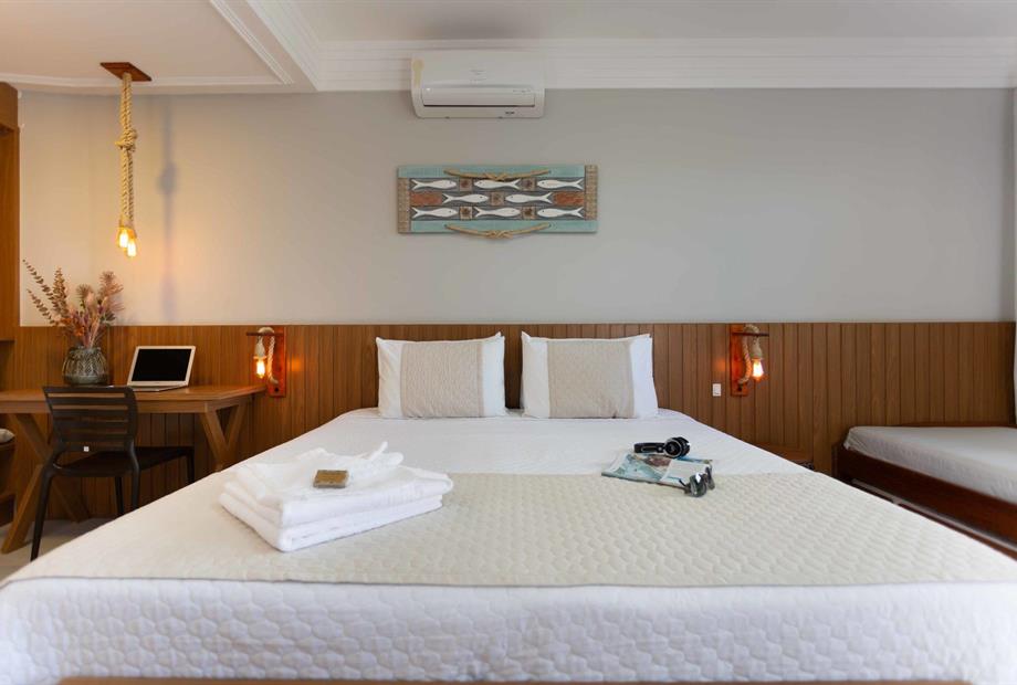 1 cama de casal King / 2 camas solteiro / Ar condicionado / TV / frigobar.