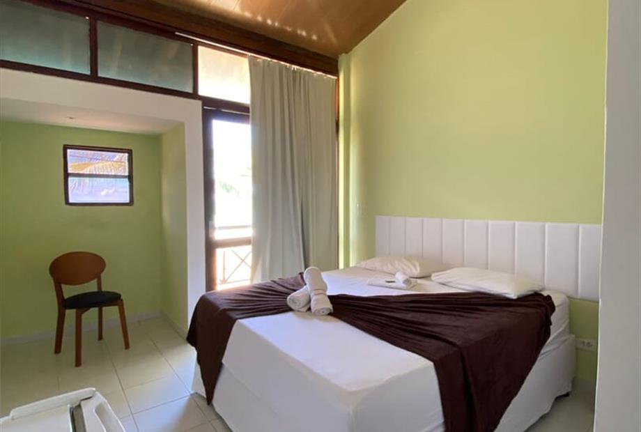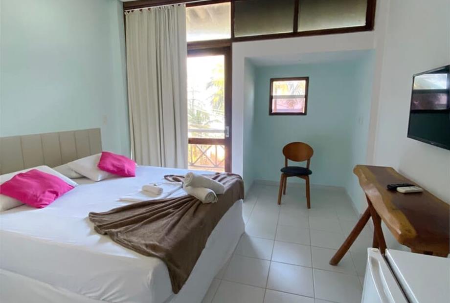 Suíte equipada com cama tipo queen, varanda privativa, banheiro com chuveiro aquecido, enxovais completos, amenidades, aparador, TV , cortin...
