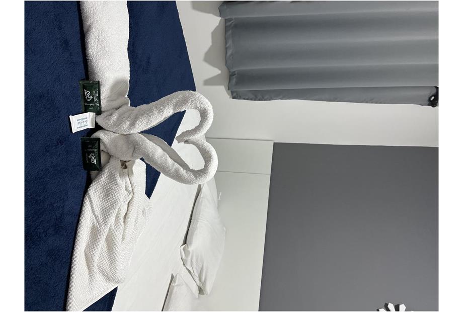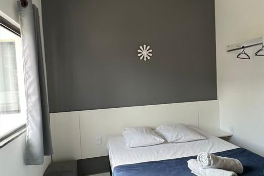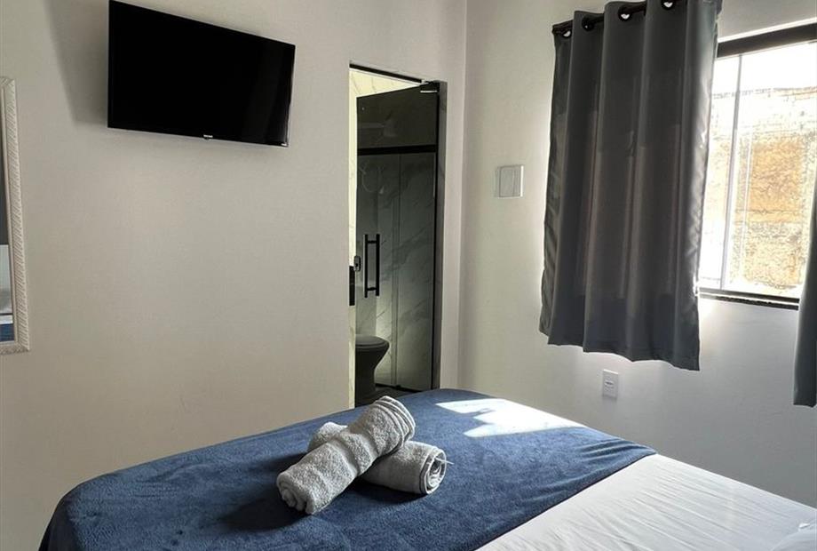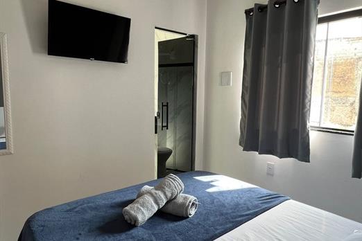Suíte compacta para casal, com ar-condicionado e TV smart.