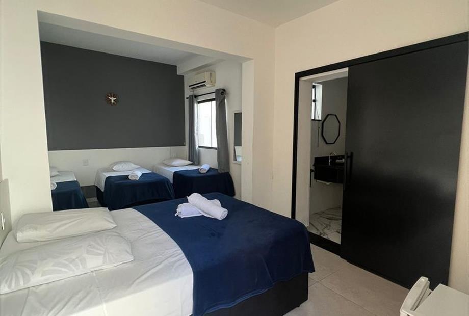 Suíte com uma cama de casal e duas camas de solteiro, equipada com ar-condicionado e TV smart.