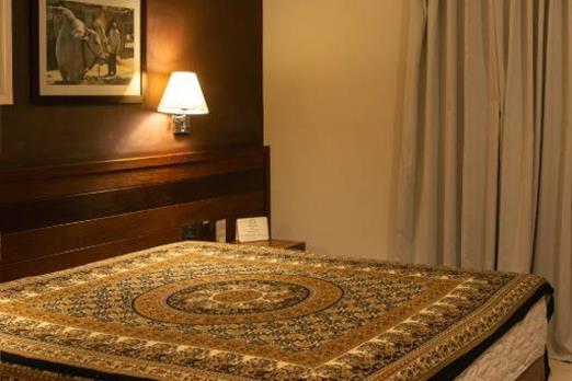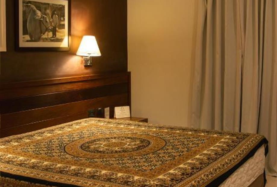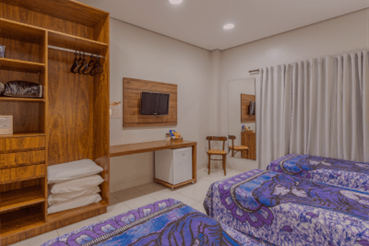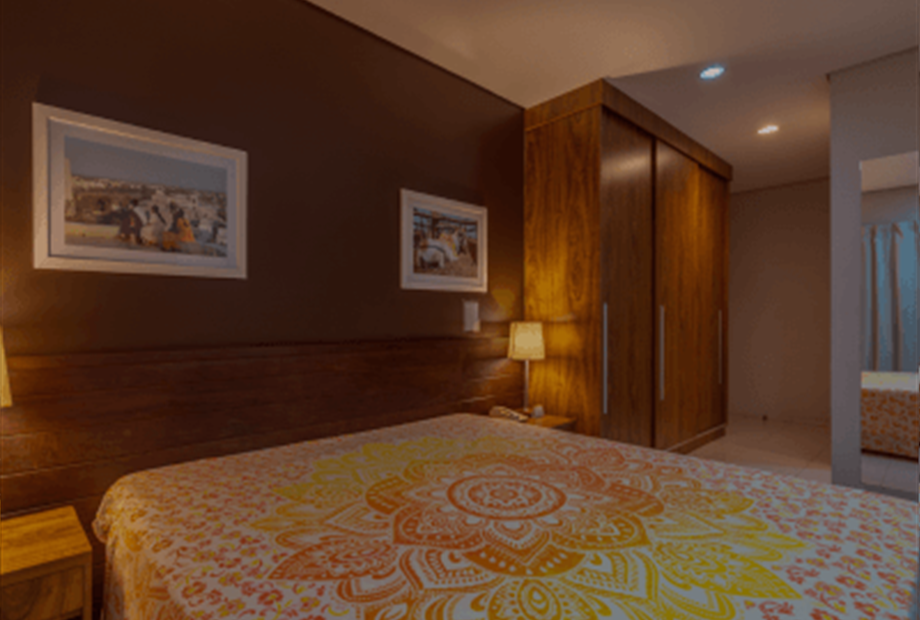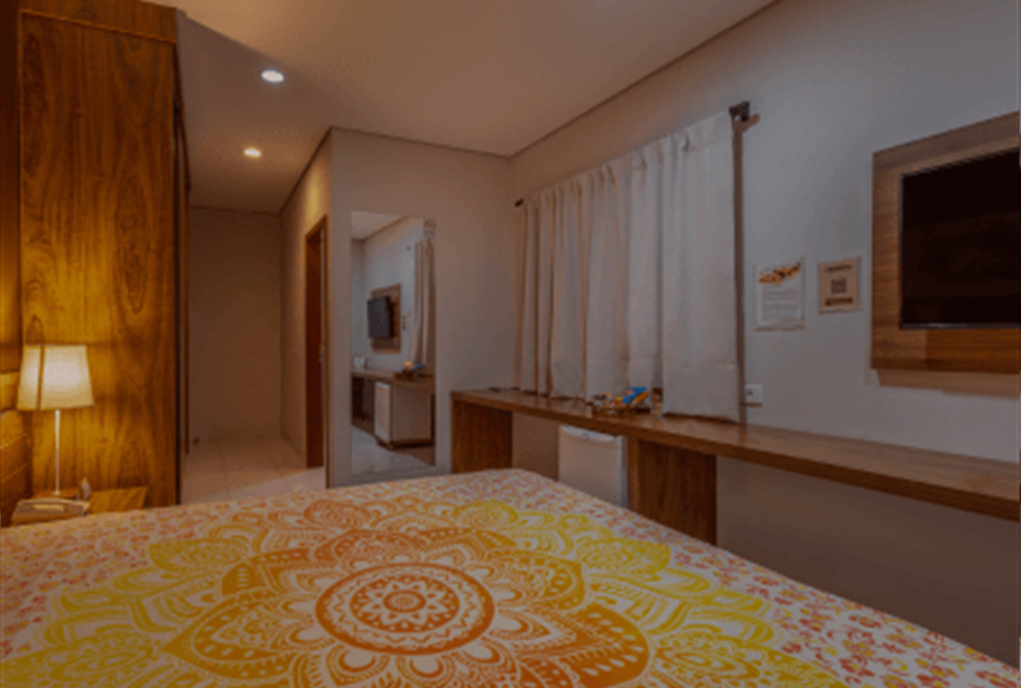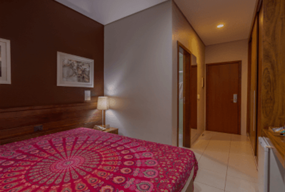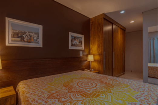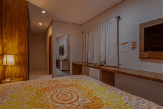 Quarto com cama de casal tamanho queen, frigobar, televisão, banheiro privativo, bancada de madeira, armários planejados e cofre. Variações...
