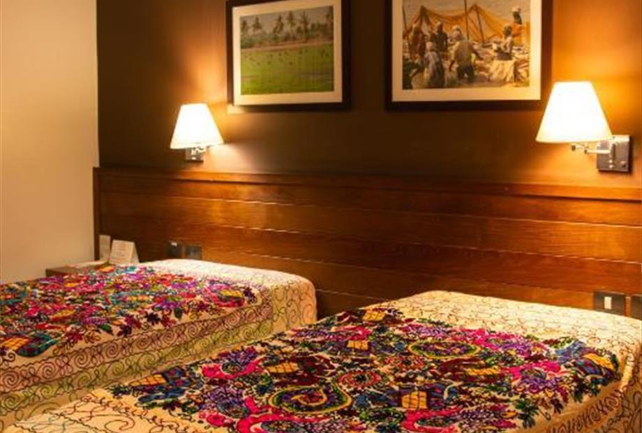 Quarto espaçoso que conta com uma decoração de temática indiana mais arrojada que os apartamentos das categorias anteriores; dispõe de ar-co...