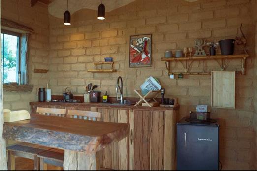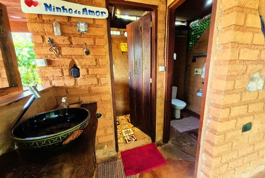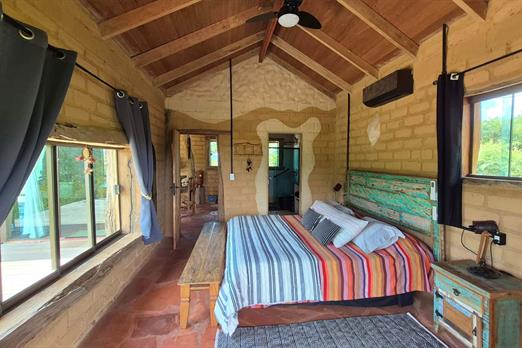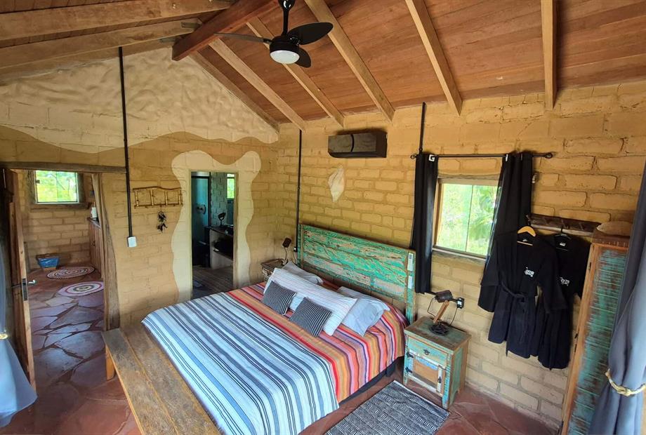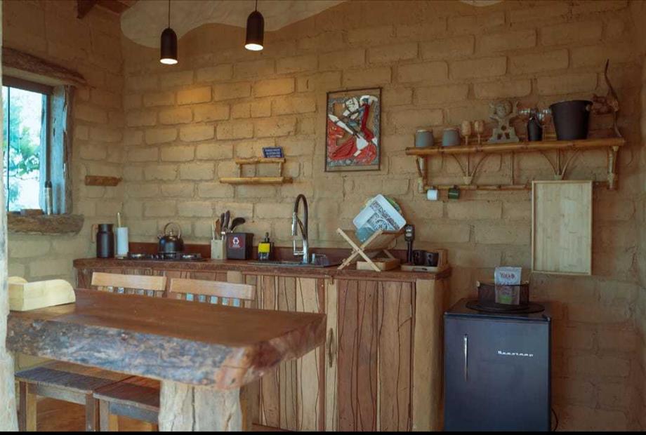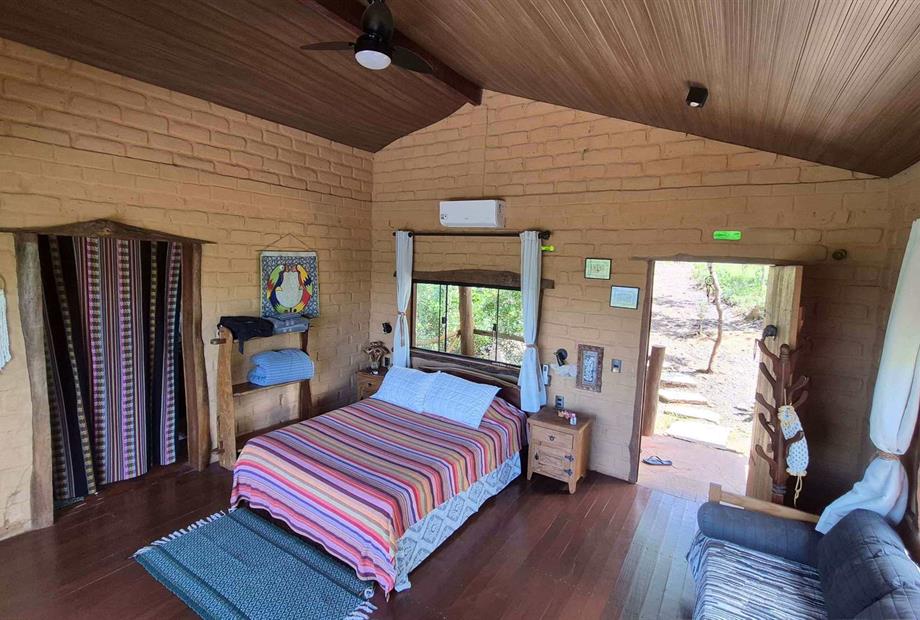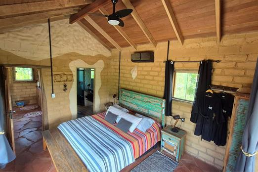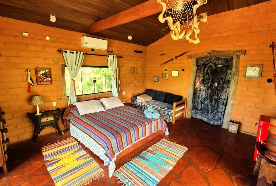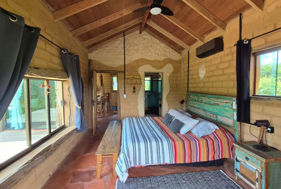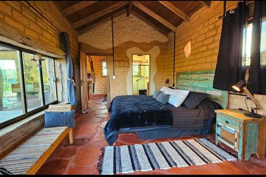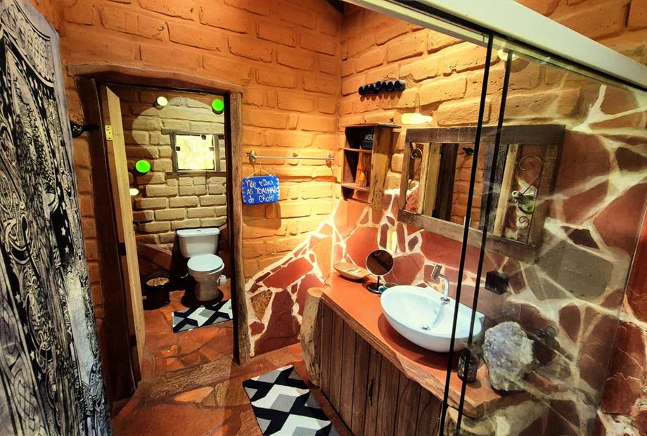Chalé feito de tijolos de adobe de terra do próprio local, madeiras e garrafas reaproveitadas, dentre outros materiais ecológicos. Possui Wi...