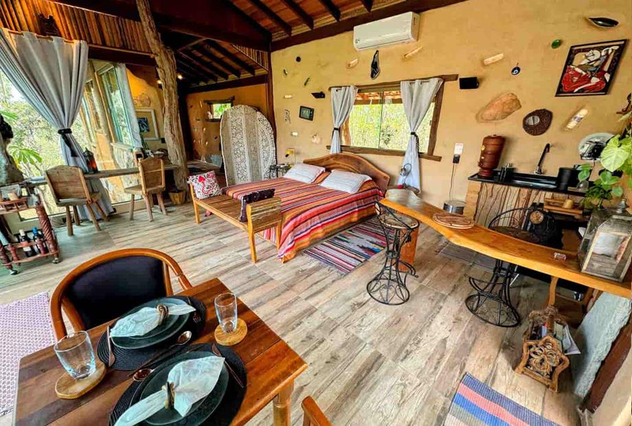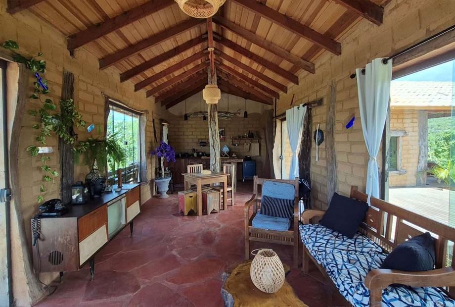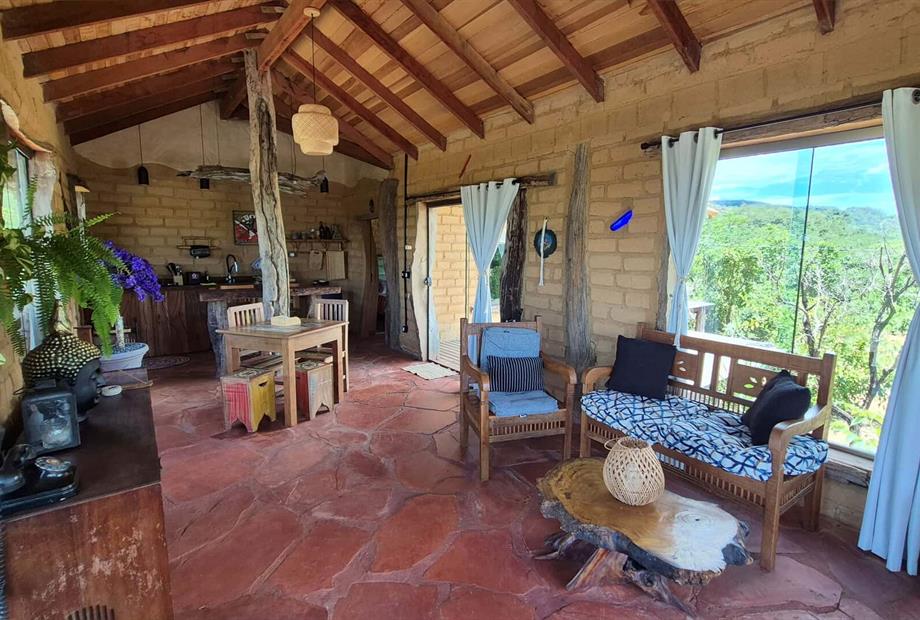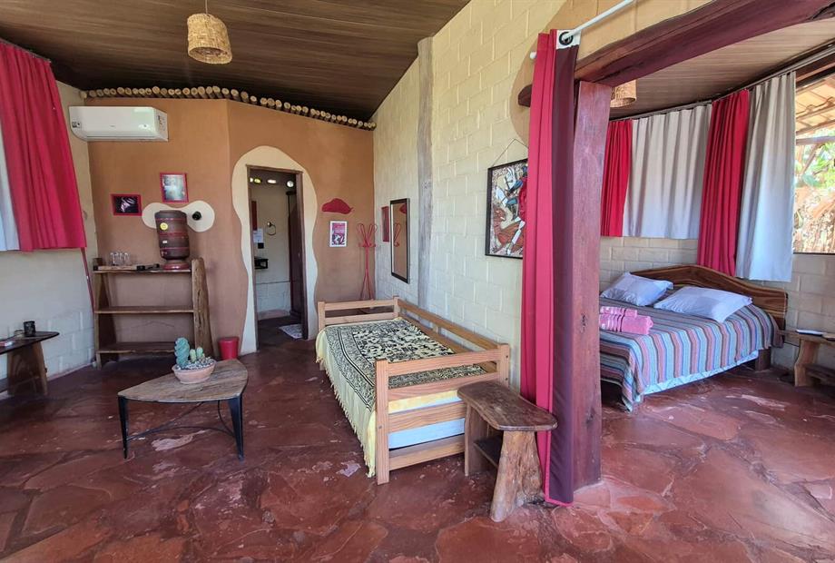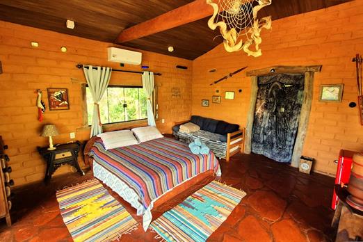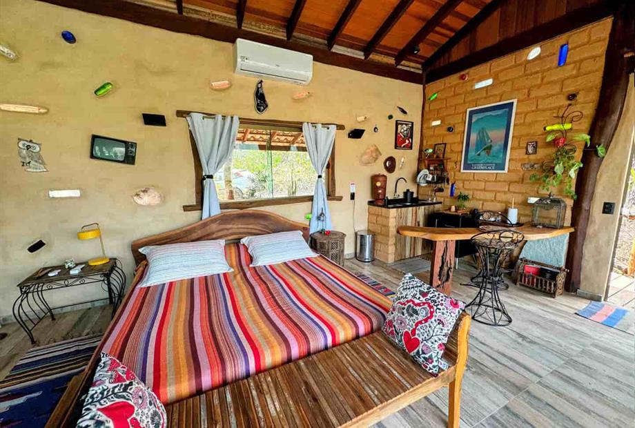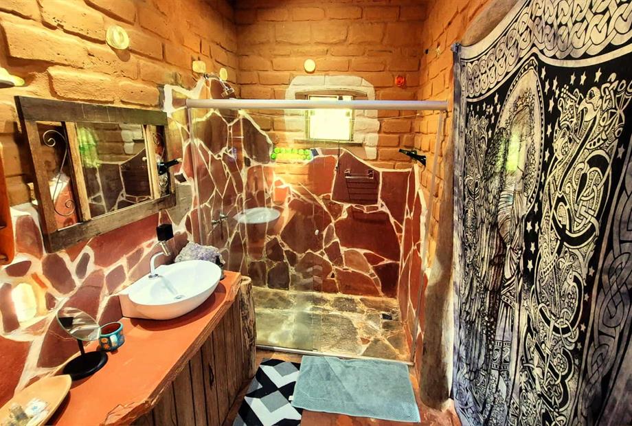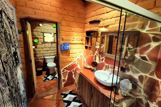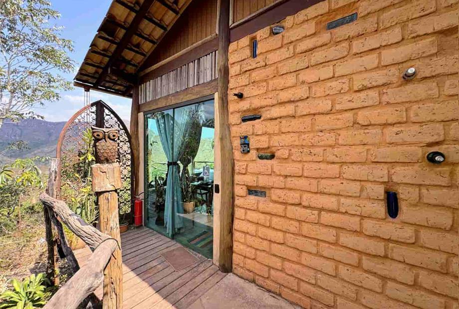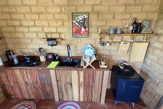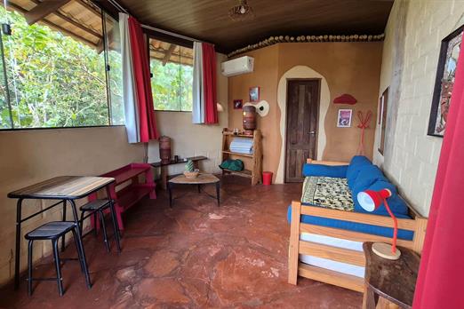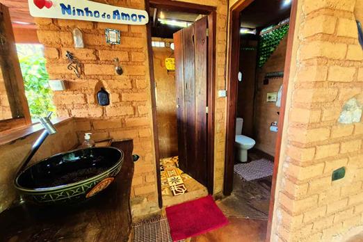 Chalé feito de tijolos de adobe de terra do próprio local, madeiras e garrafas reaproveitadas, dentre outros materiais ecológicos. Possui Wi...