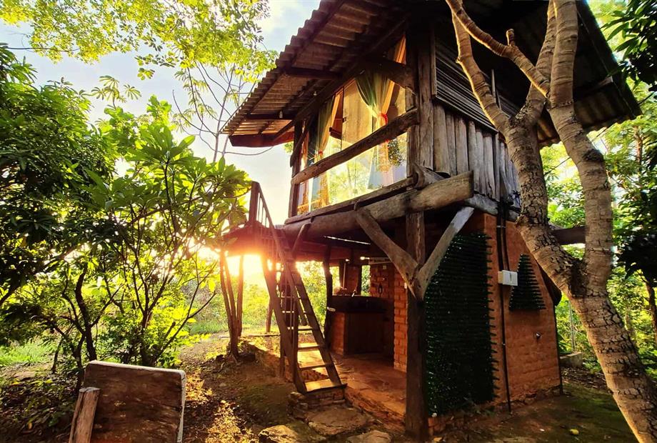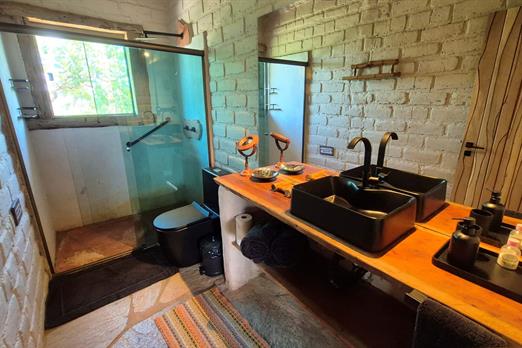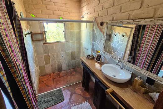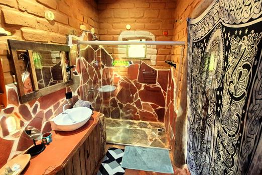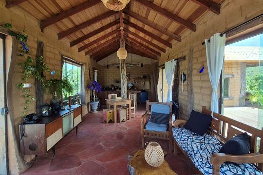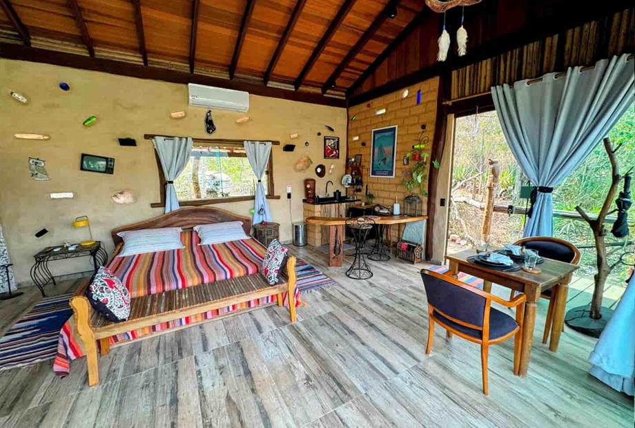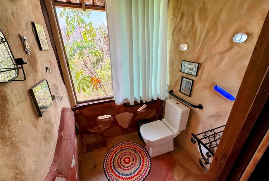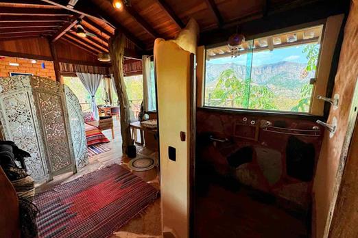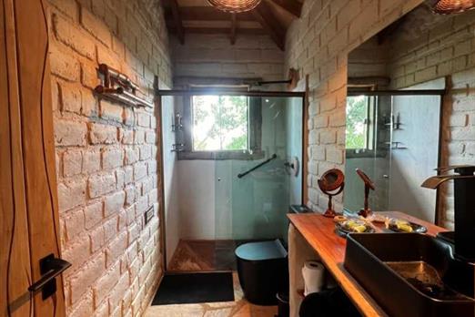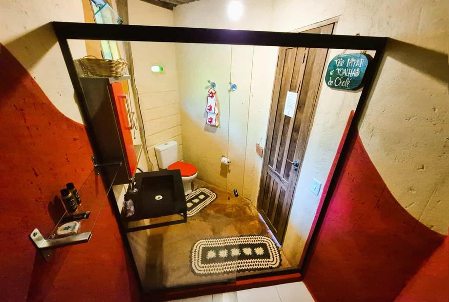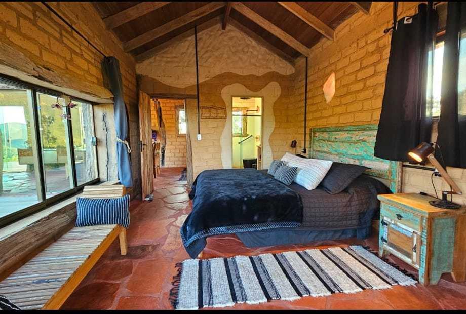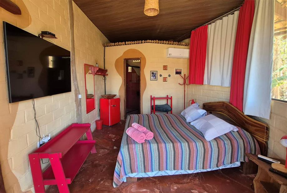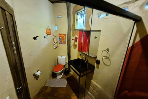 Chalé feito de tijolos de adobe de terra do próprio local, madeiras e garrafas reaproveitadas, dentre outros materiais ecológicos. Possui Wi...