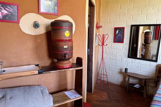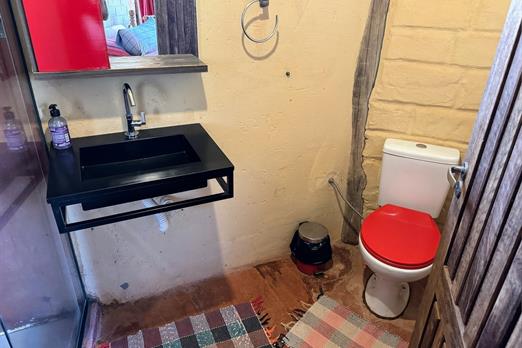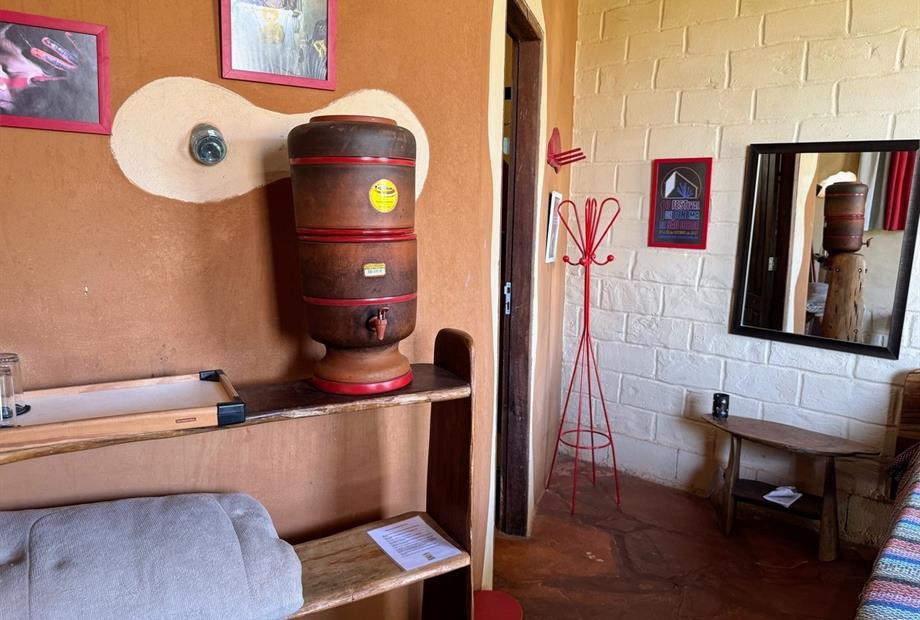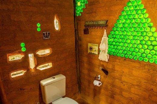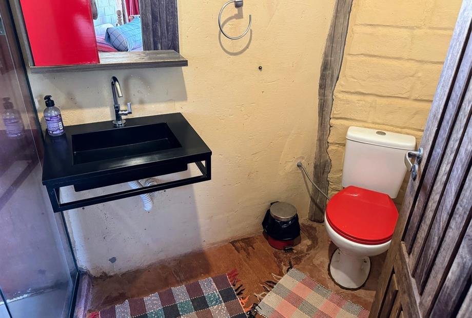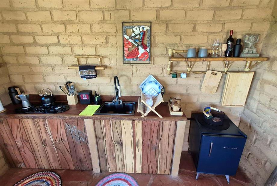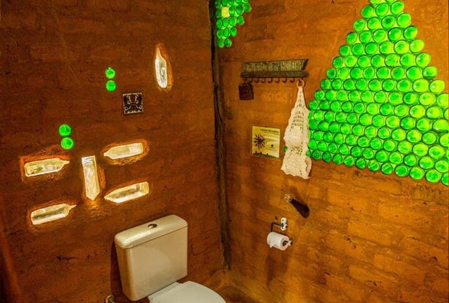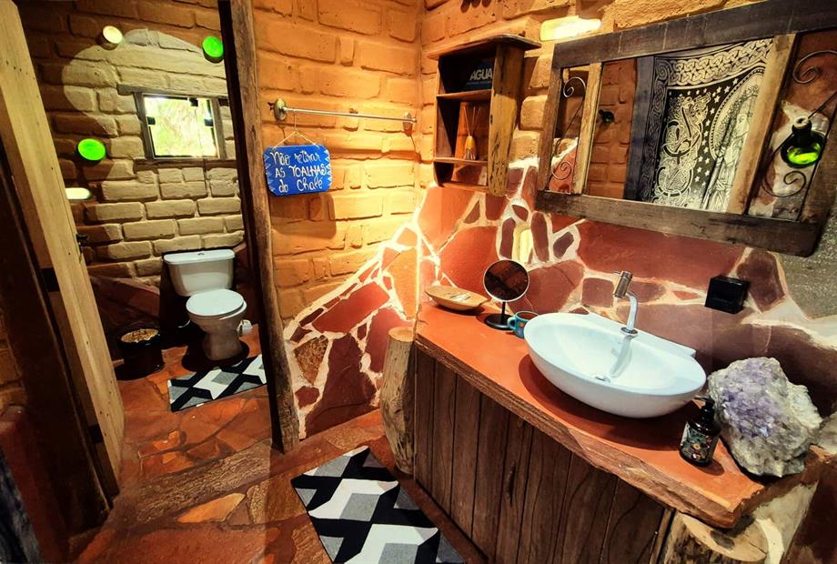 Chalé feito de tijolos de adobe de terra do próprio local, madeiras e garrafas reaproveitadas, dentre outros materiais ecológicos. Possui ág...