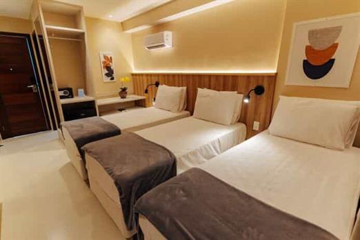 Ideal para famílias ou grupos pequenos, o quarto triplo oferece conforto e praticidade, com a belíssima vista para a praia e o Morro do Care...