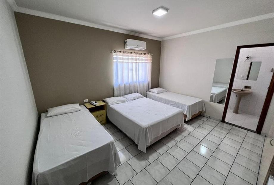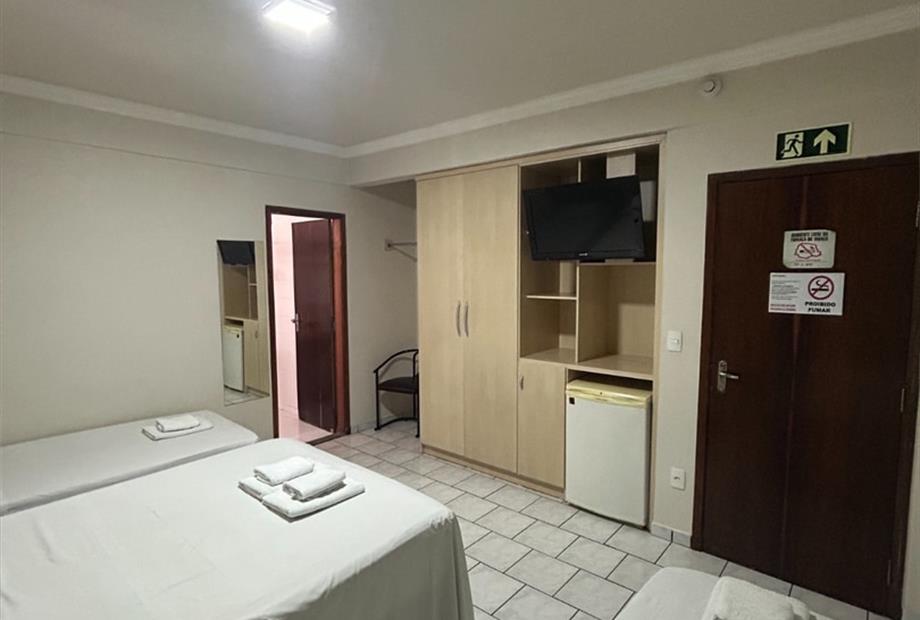Apartamento possui 1 cama de casal + 2 camas de solteiro, ar condicionado e frigobar.