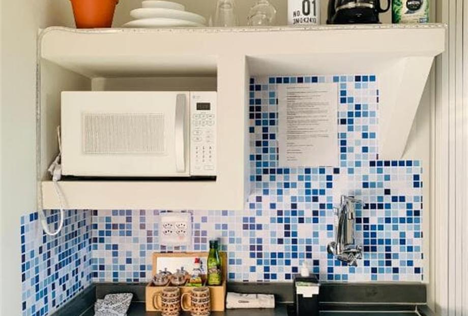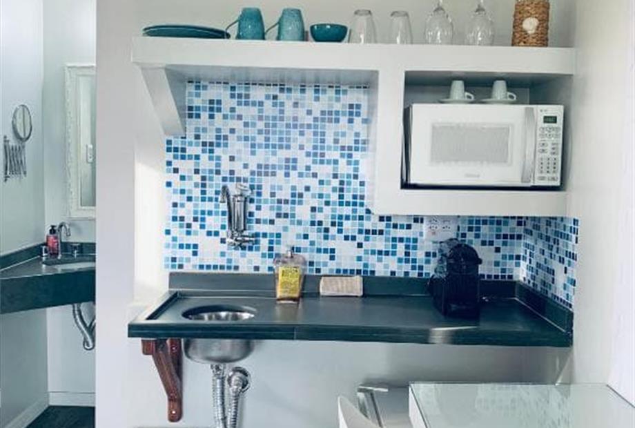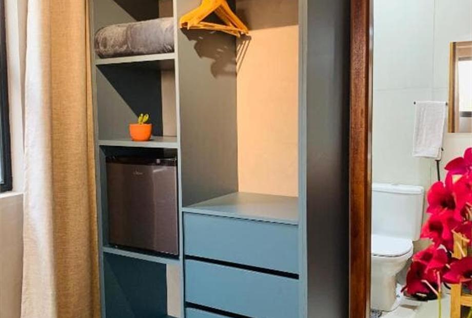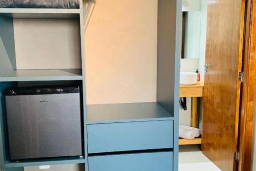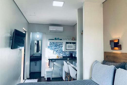 Suíte de 15 m² com 01 cama de casal, ar-condicionado, TV 32', cozinha compacta com microondas, cafeteira elétrica e frigobar desabastecido.