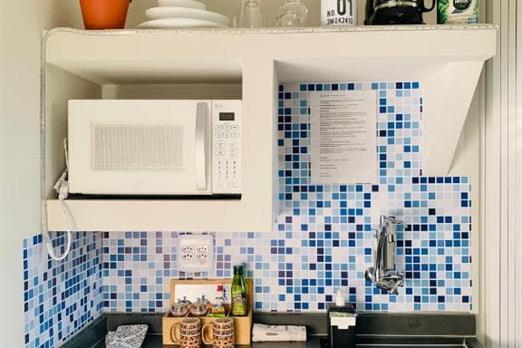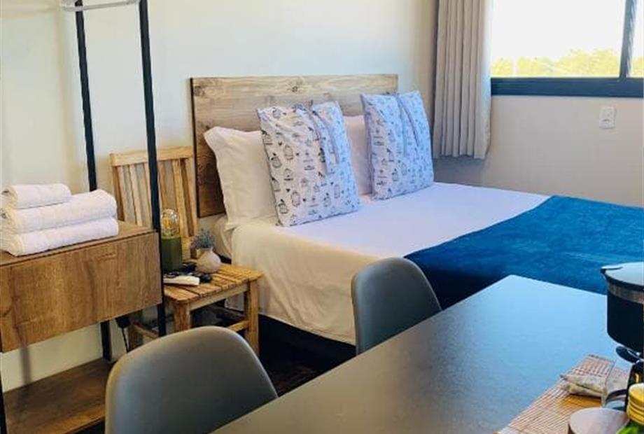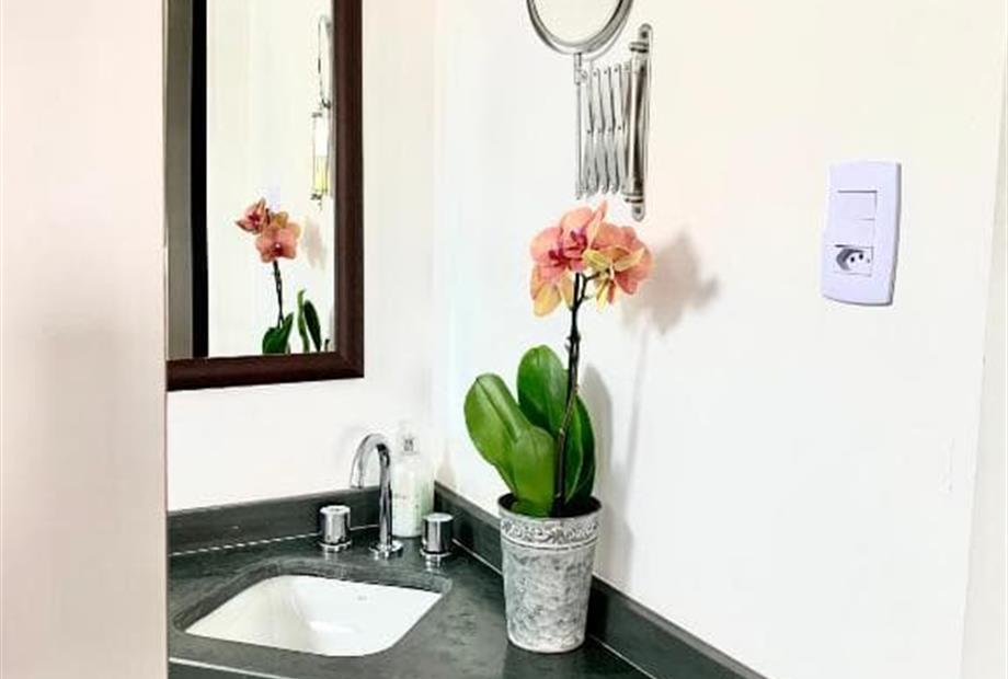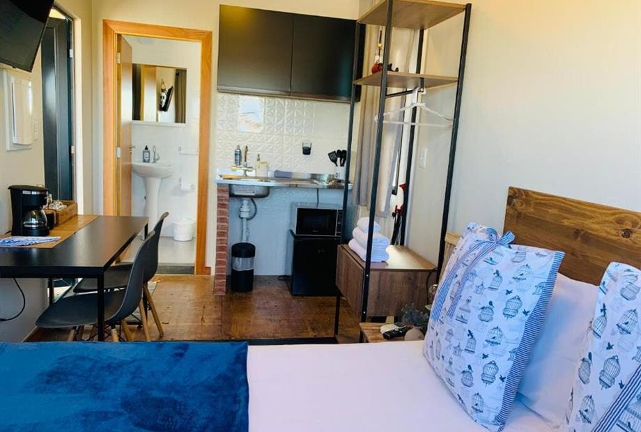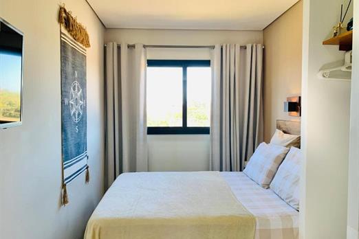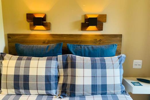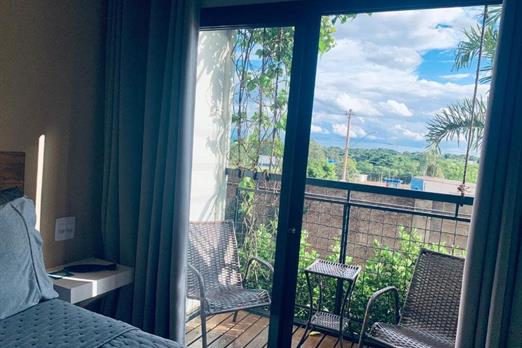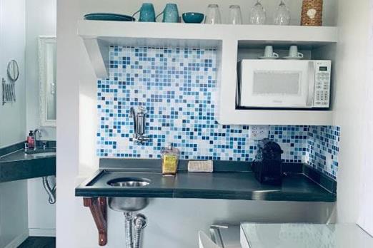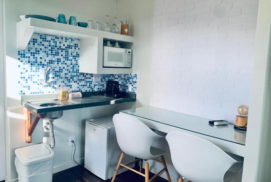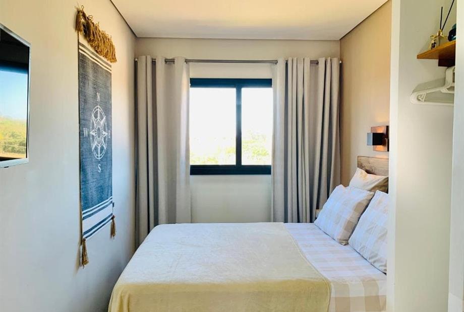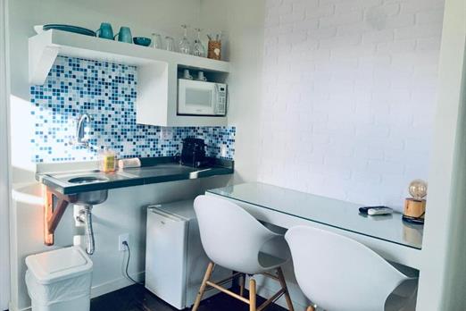 Suíte de 15 m² com varanda, 01 cama de casal, ar-condicionado, TV 32', cozinha compacta com fogão por indução, microondas, cafeteira elétric...