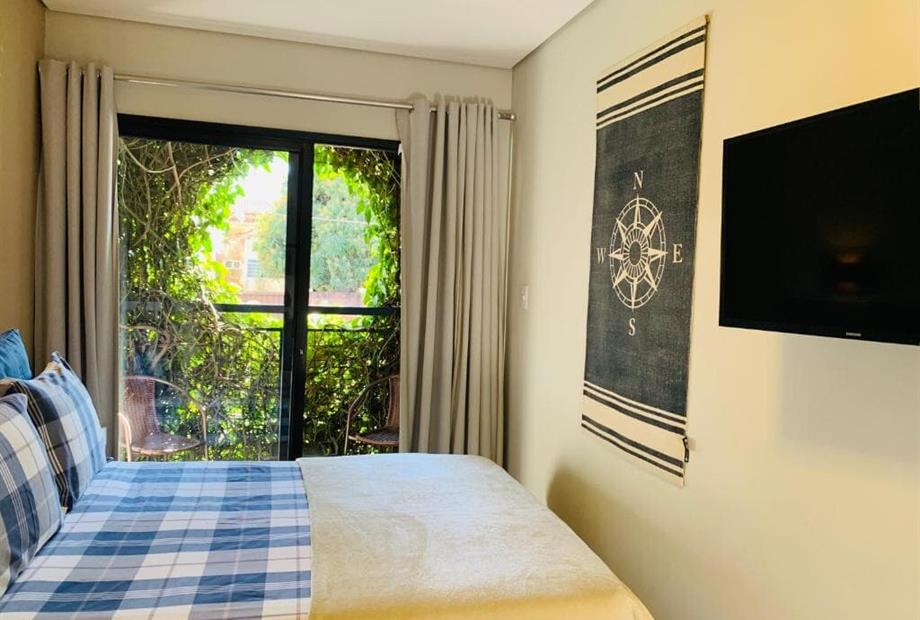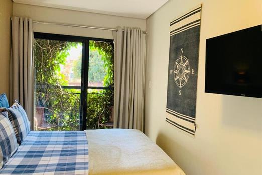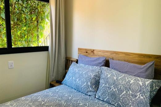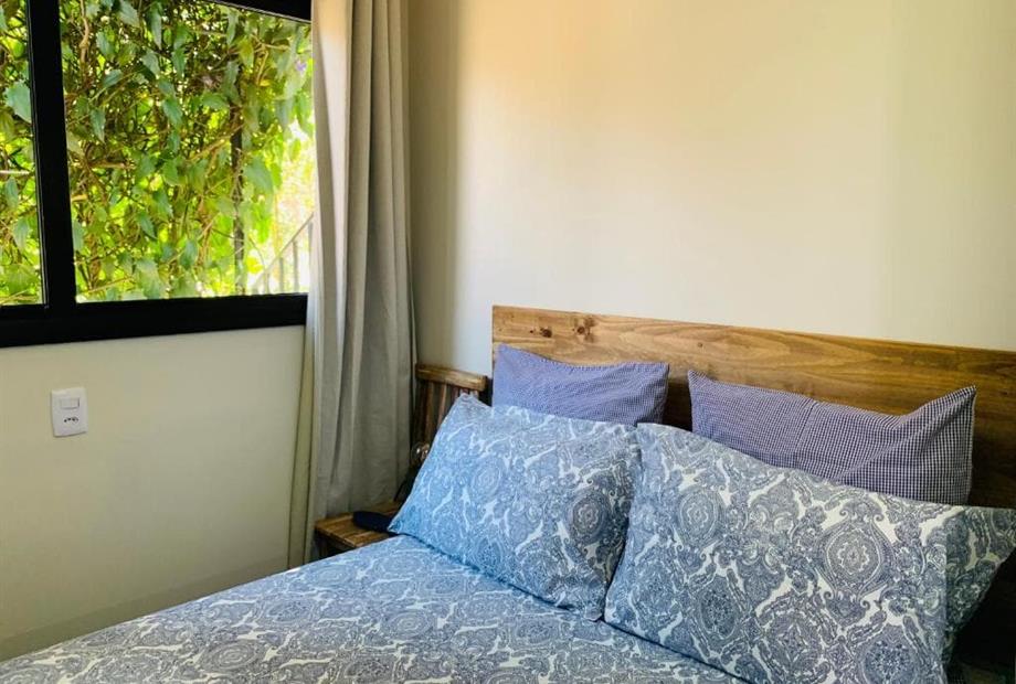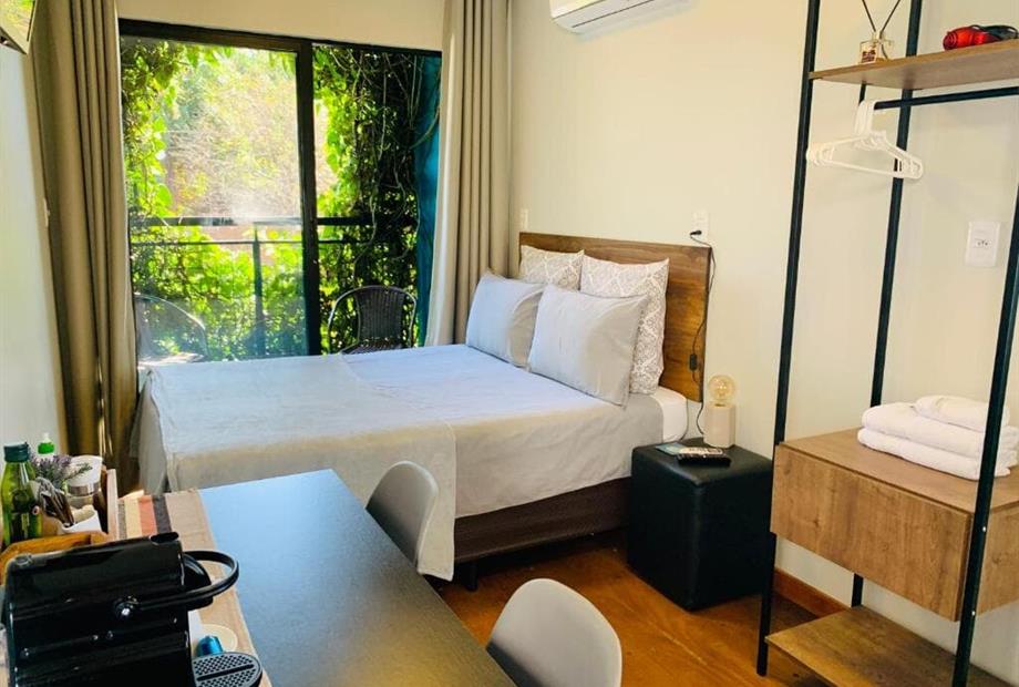 Suíte de 15 m² com vista para o jardim, com 01 cama de casal, ar-condicionado, TV 43' e frigobar desabastecido.