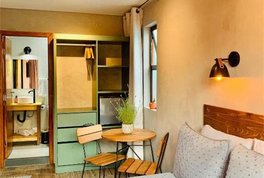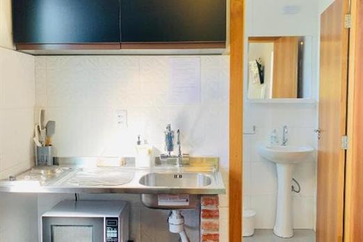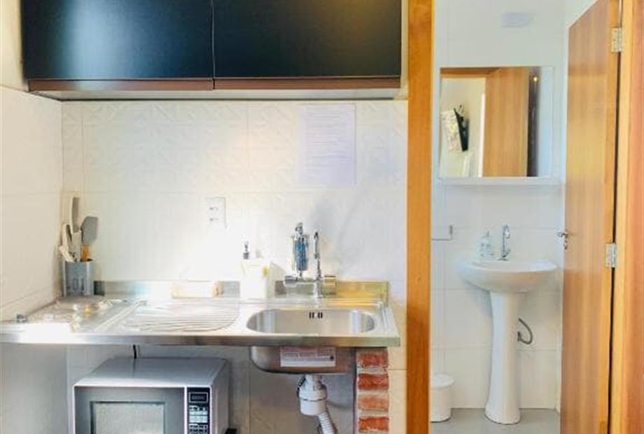 Suíte térrea com 15 m² adaptada para pessoas com mobilidade reduzida com 01 cama de casal, ar-condicionado, TV 32', cozinha compacta com mic...