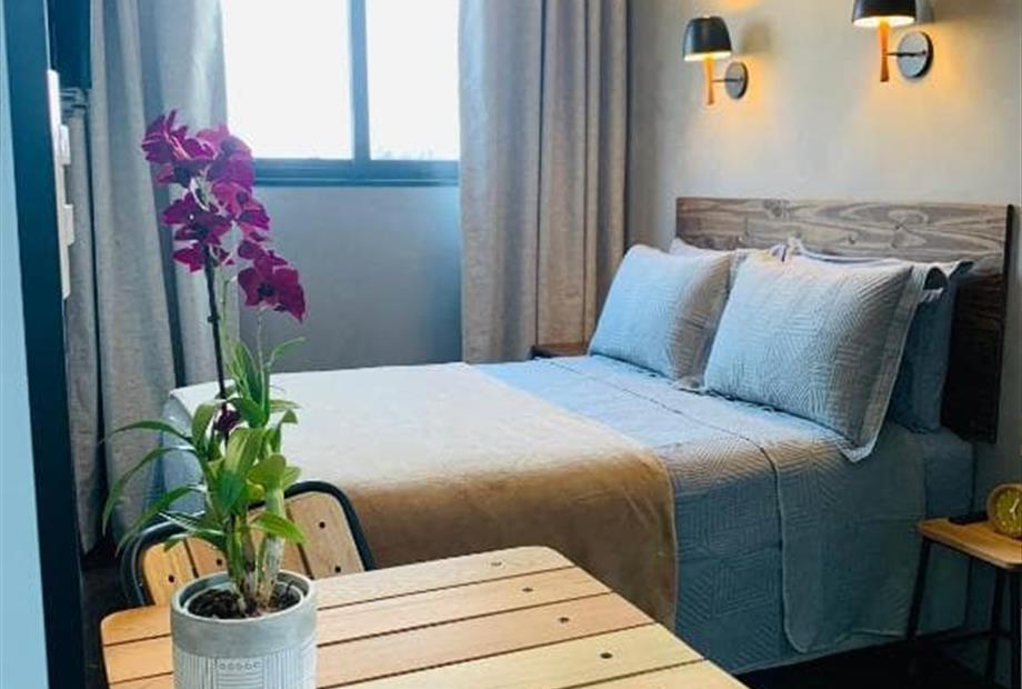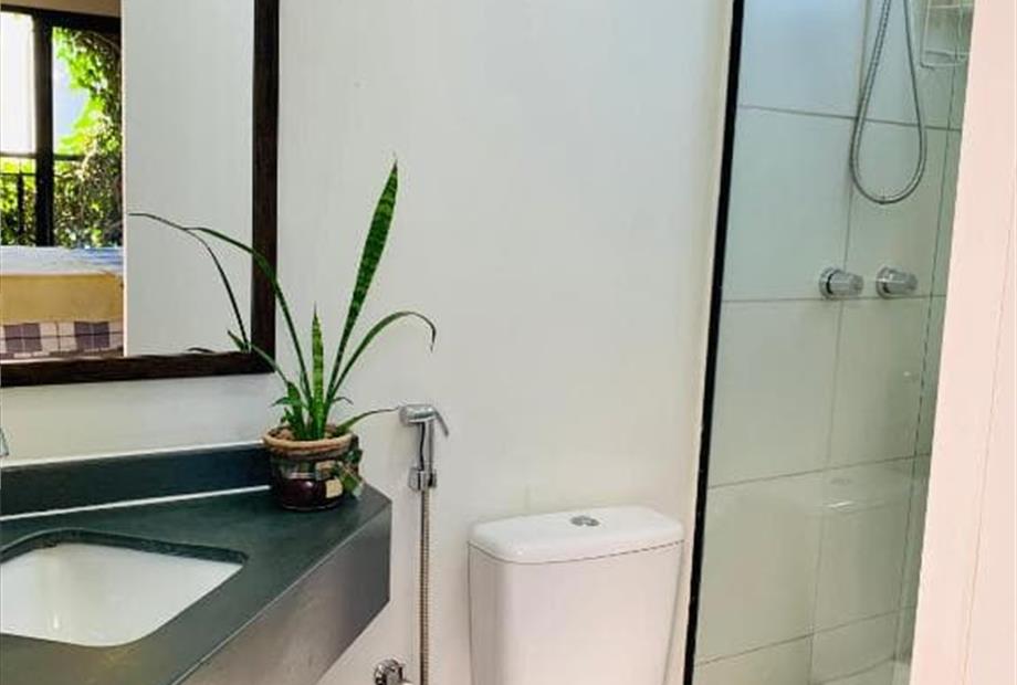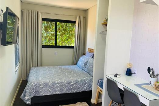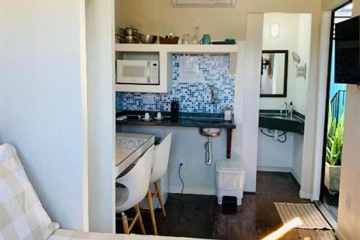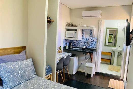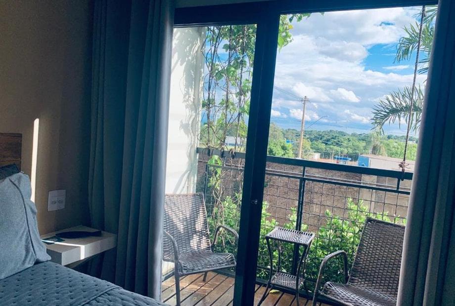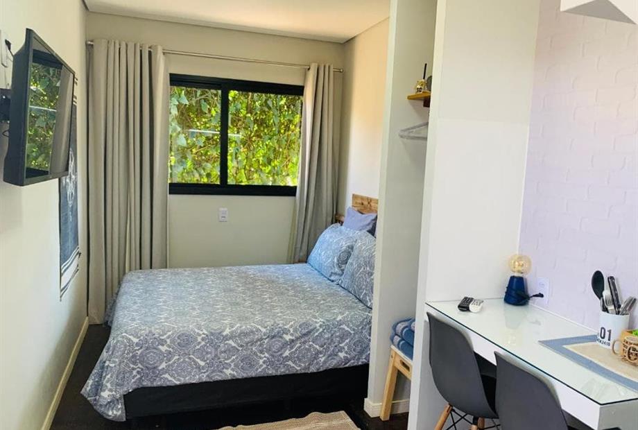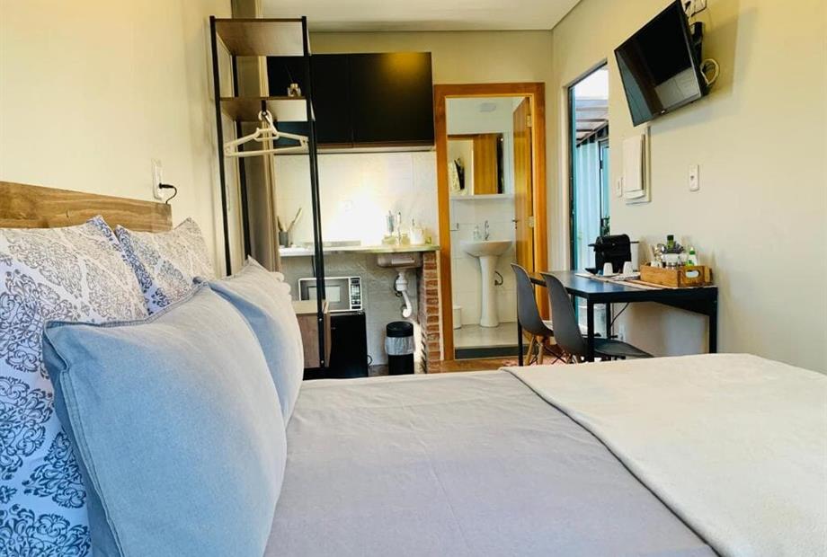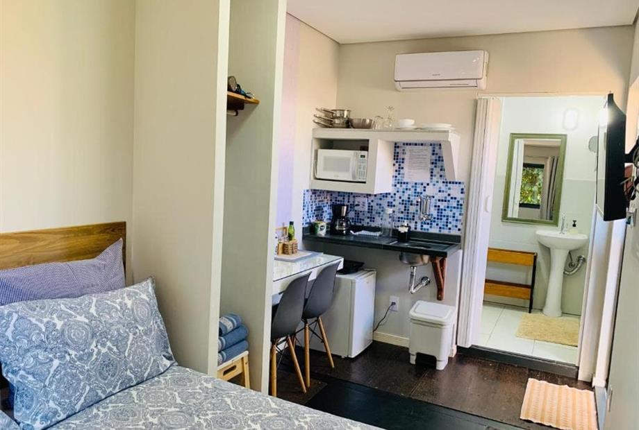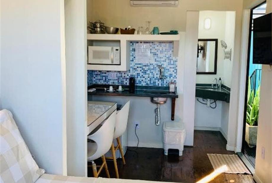 Suíte térrea de 15 m² com varanda, 01 cama de casal, ar-condicionado, TV 32', cozinha compacta com microondas, cafeteira elétrica e frigobar...