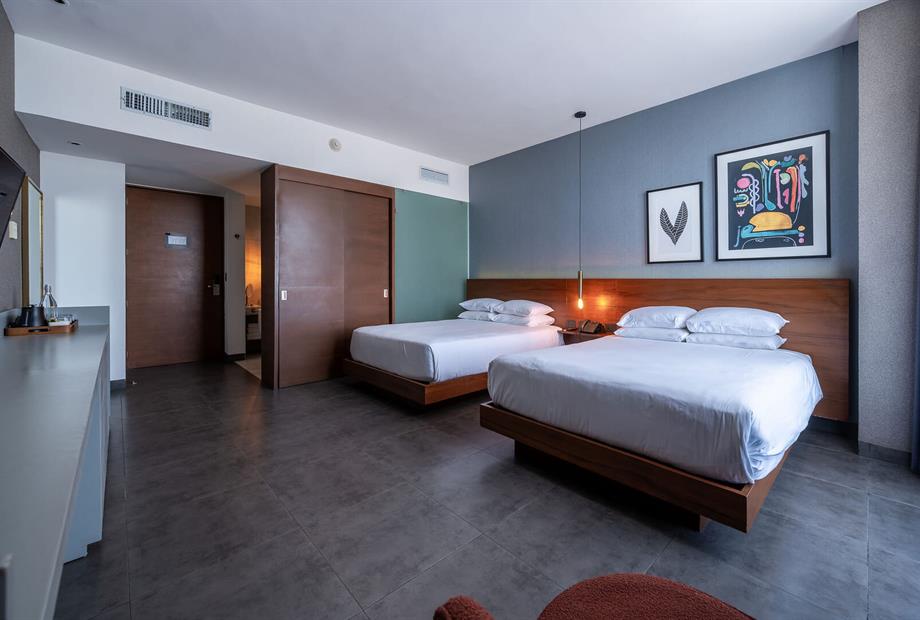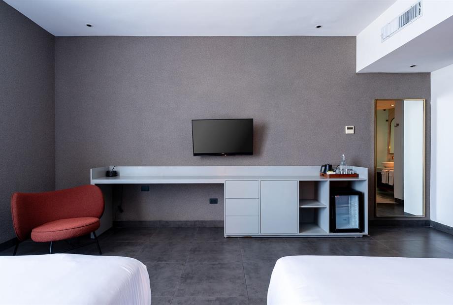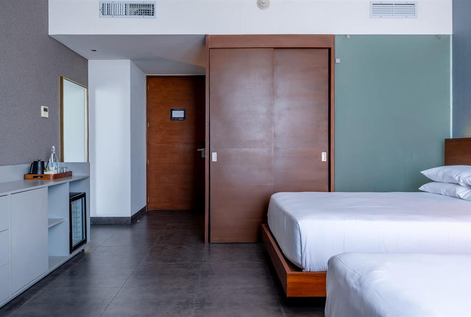 Habitación con dos camas matrimoniales, Smart TV, aire acondicionado, baño privado con ducha, cafetera, ventilador, caja de seguridad, secad...