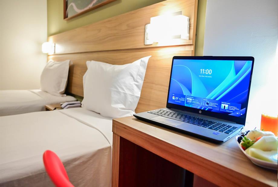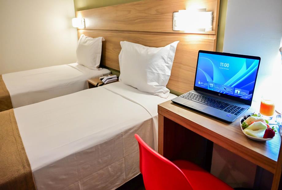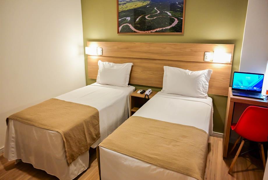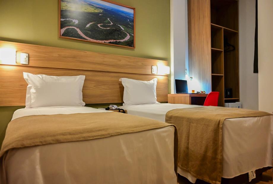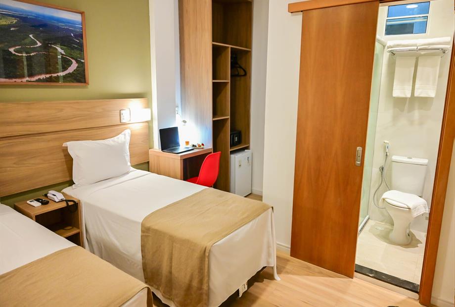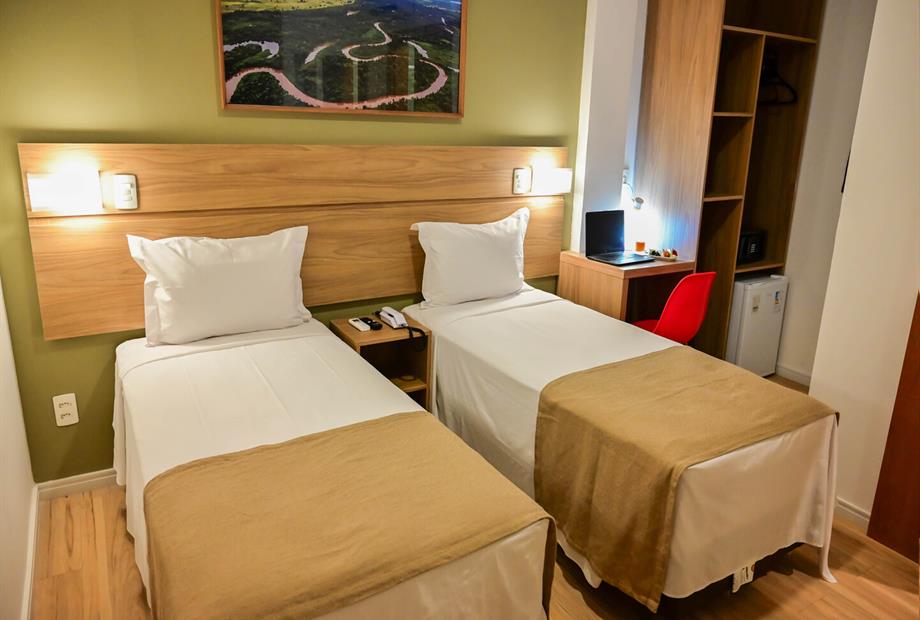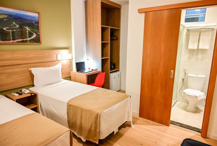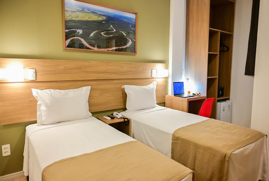 Possui 2 camas de solteiro, wi-fi, ar-condicionado, chuveiro (ducha), guarda-roupa aberto, cofre, estação de trabalho, secador... (ver mais)