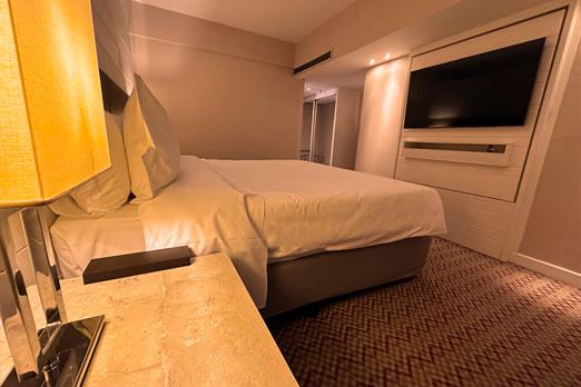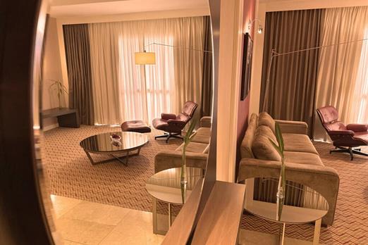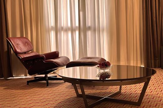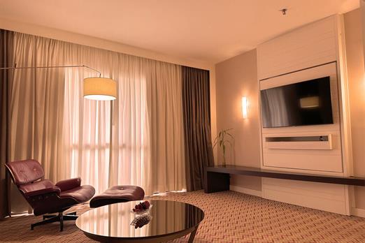 Suíte de 73m² e LCD 30", cama king size, sala com LCD 40", banheiro com banheira, varanda. Bancada para trabalho, minibar, cofre individual...