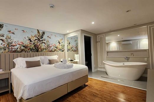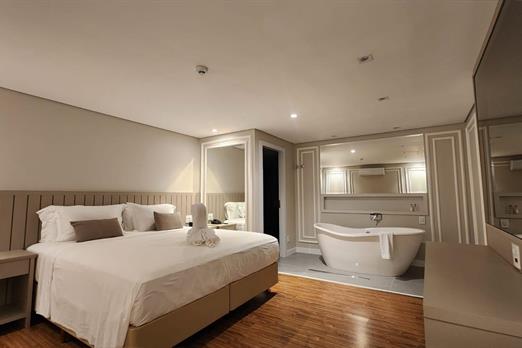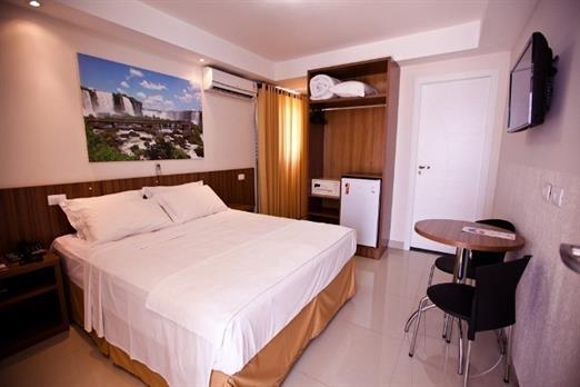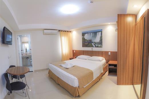 SUÍTE IGUAÇU SUITE COM 28 METROS QUADRADO/ TV A CABO DE 65 POLEGADAS 4K WIFI, JACUZZI, Ocup.max.: 2 Pessoas Área: 28m2 Possui cama King Size...