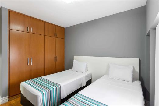 Apartamento com 49m² possui 01 cama de casal ou 02 de solteiro. Equipado com 01 banheira, 01 sala, 01 dormitório e 01 cozinha, com TV LCD 32...