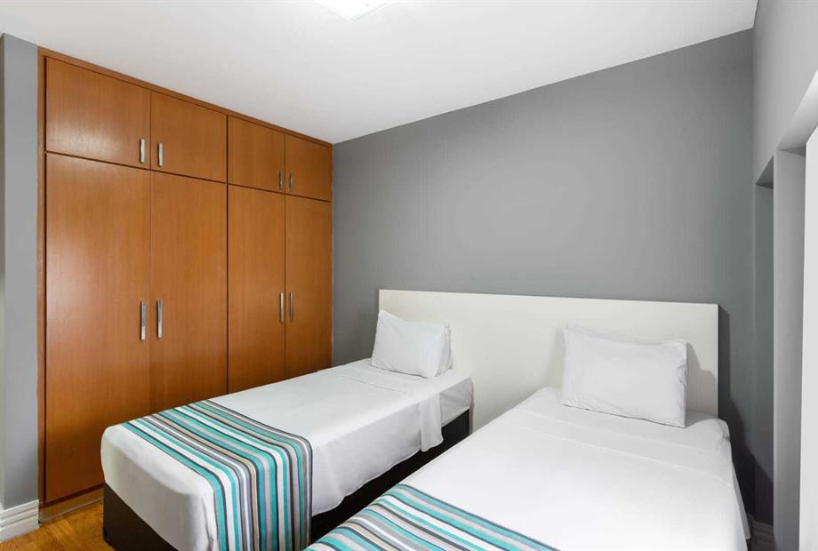 Dois quartos, dois banheiros, sala de estar e cooking facilities.