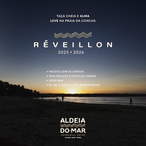 No Pacote de Réveillon 2025/2026 do Aldeia do Mar Sensorial Hotel estão inclusos café da manhã, festa da virada com ceia e open bar de bebidas alcoólicas | soft drinks e música ao vivo.