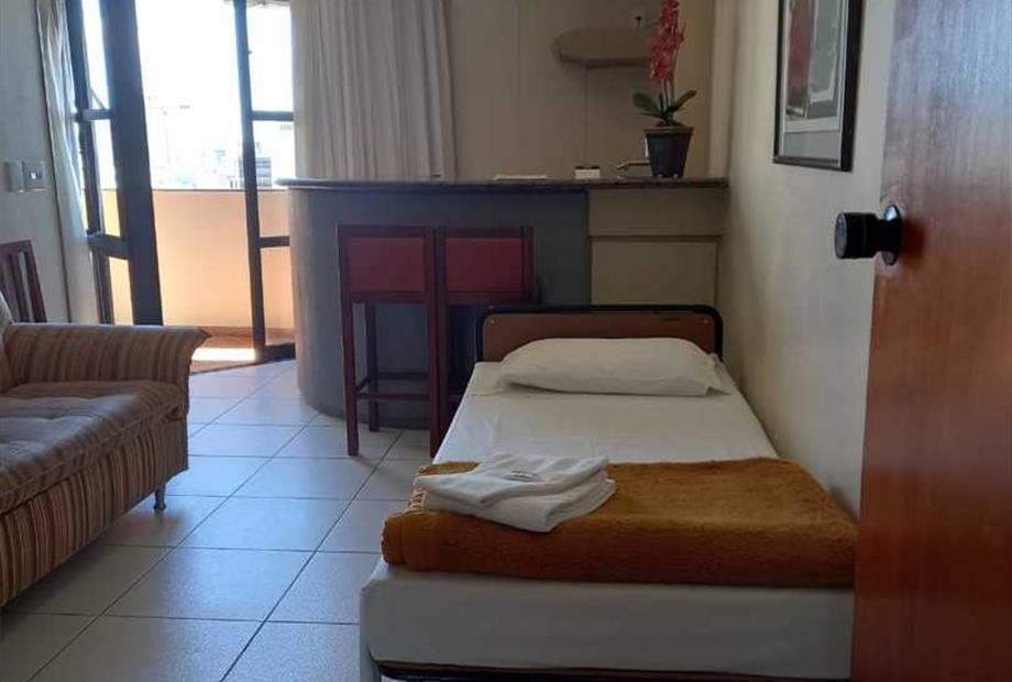 Apartamento com 2 camas de solteiro no quarto e 01 cama de solteiro montada na sala.