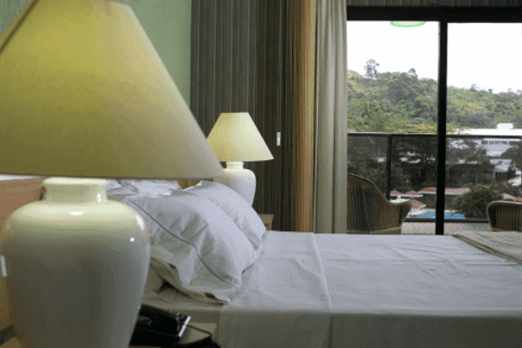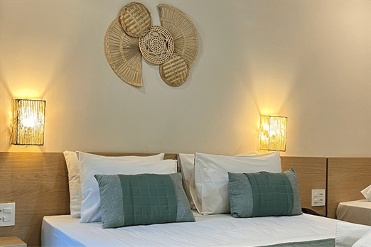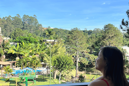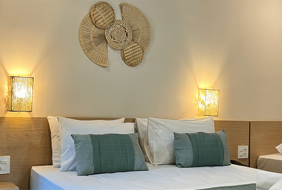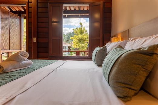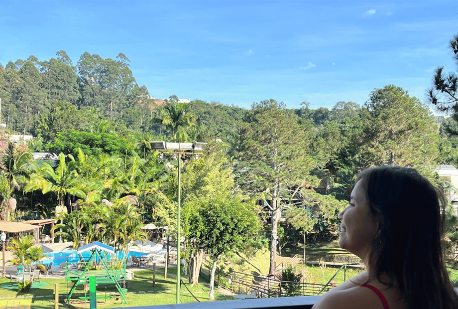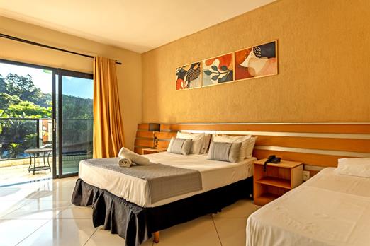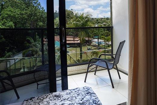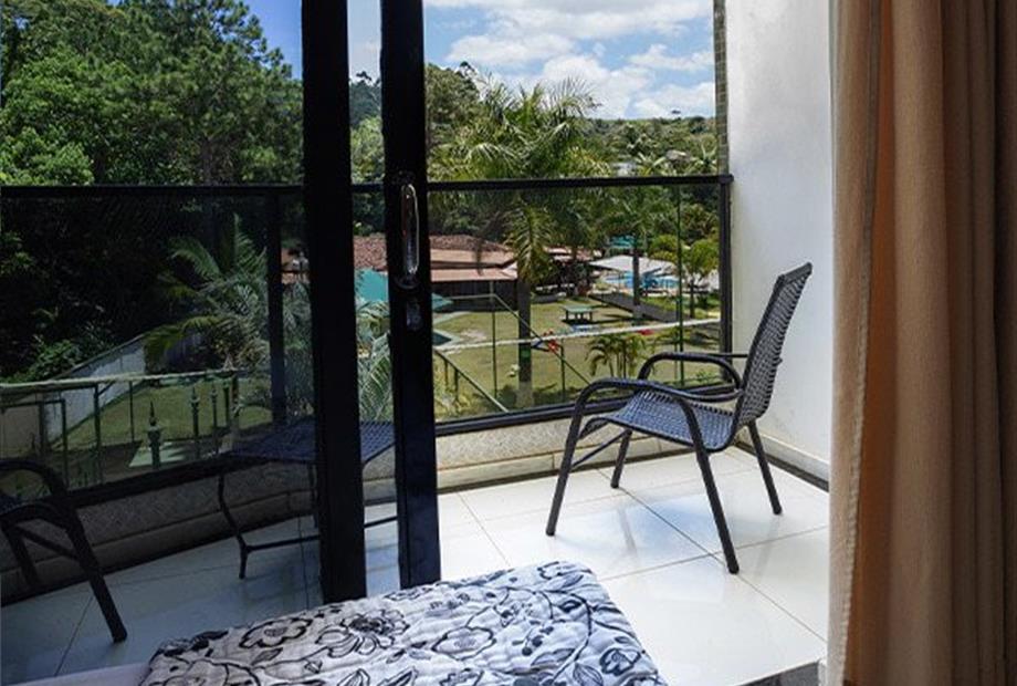 Quarto espaçoso, com varanda grande e vista aberta pro verde do hotel. Ambiente iluminado, pronto pra acolher quem quer acordar devagar, tom...