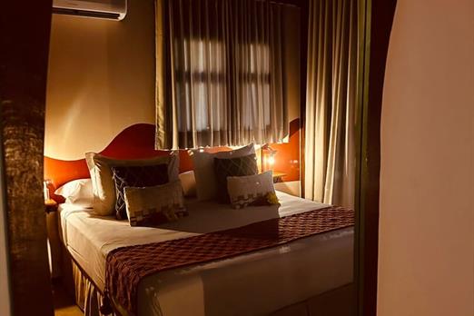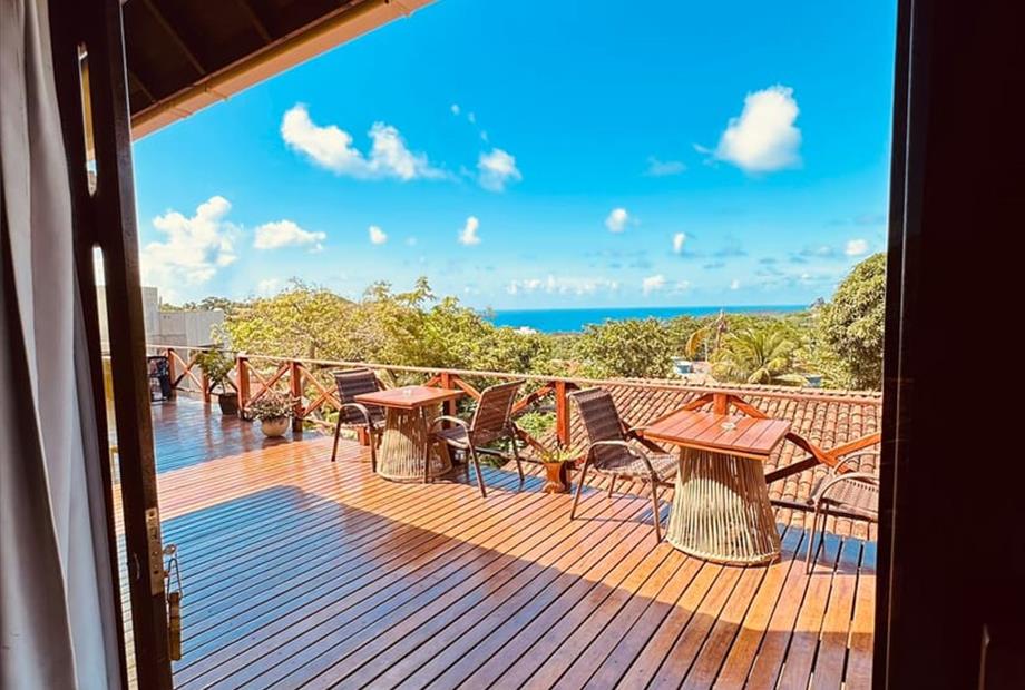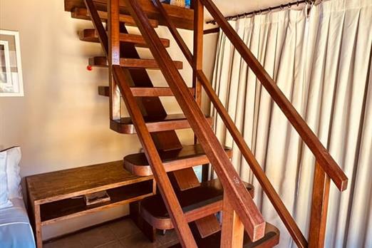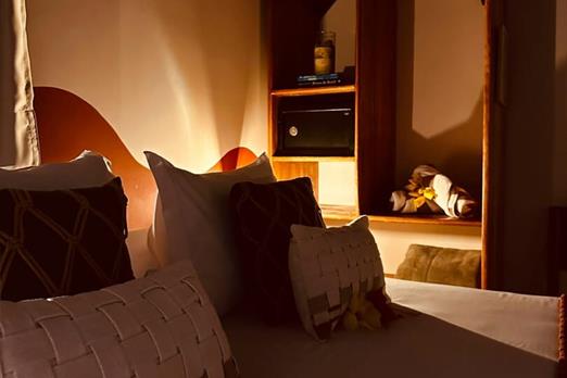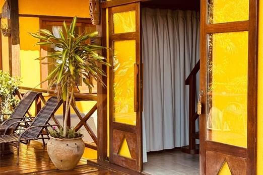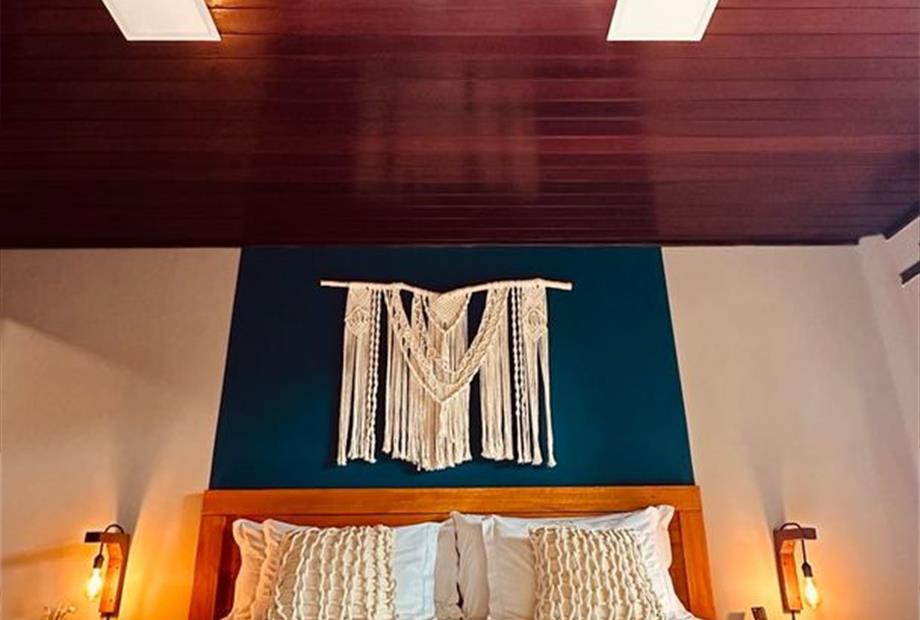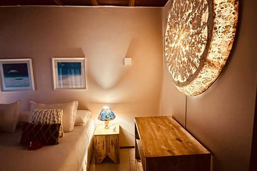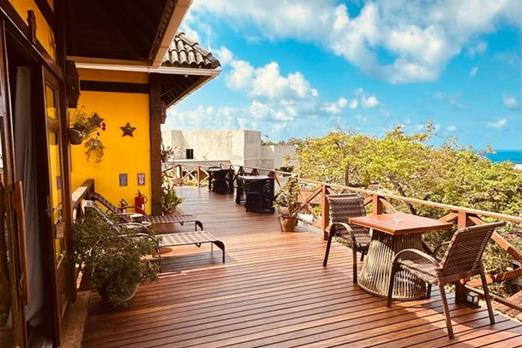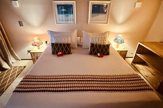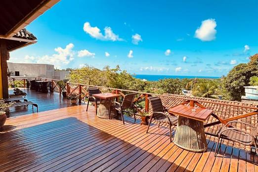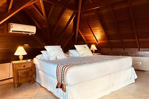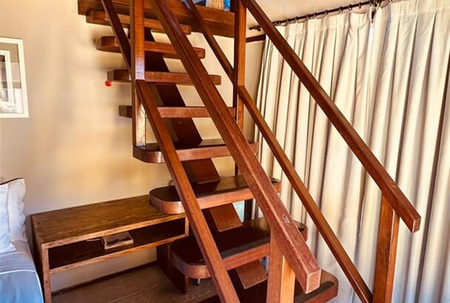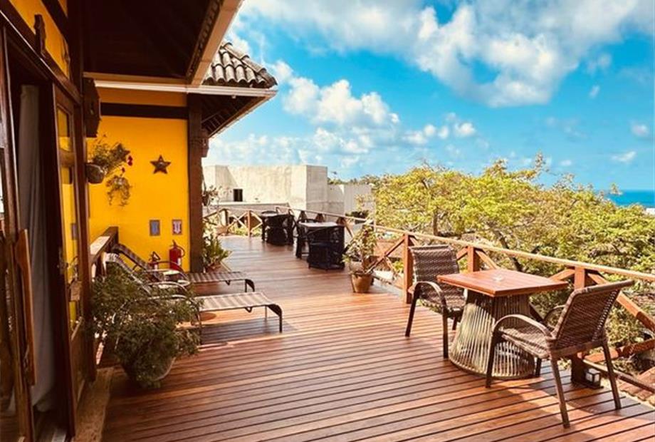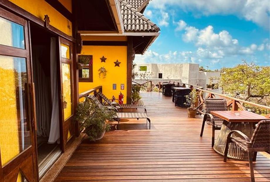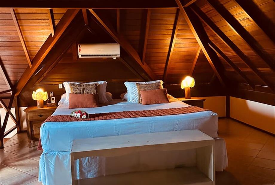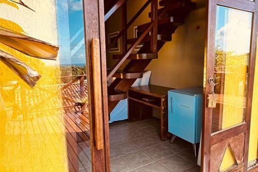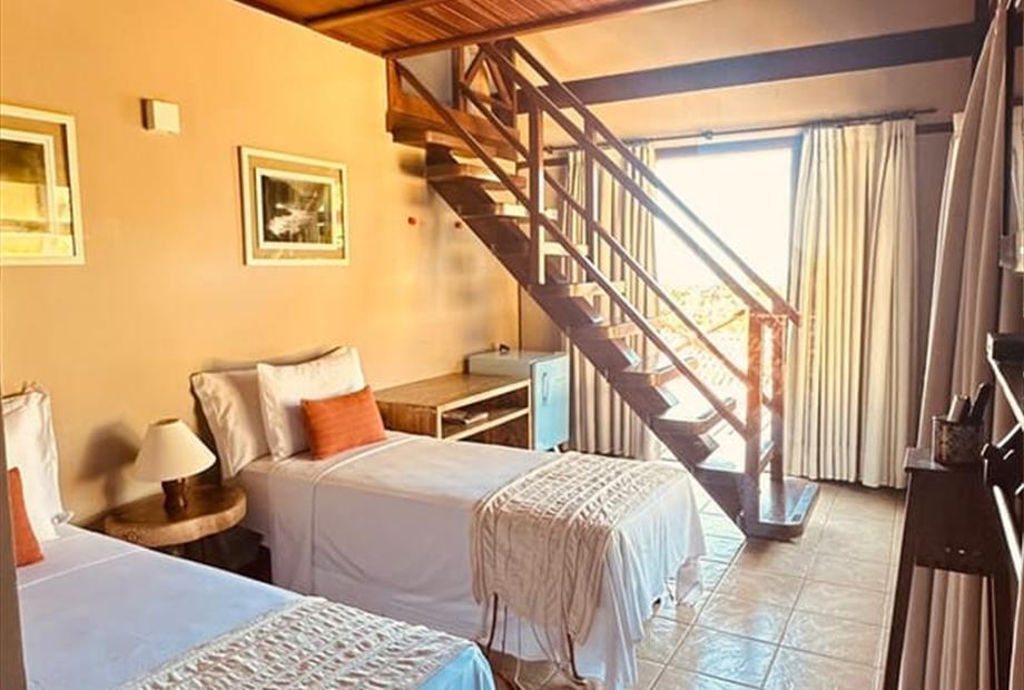 SUÍTE COM 02 AMBIENTES No andar superior da pousada com vista mar. - Ambiente Superior: 01 mezanino para casal com cama super king, ar-cond...