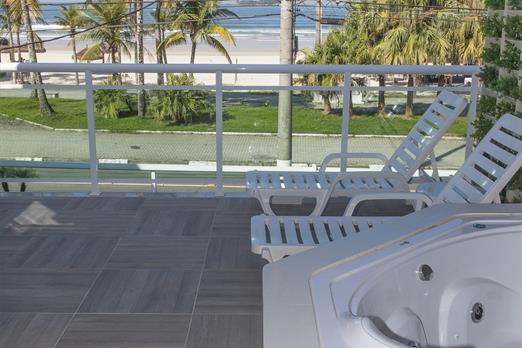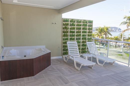 Localizado no andar superior frente total ao mar, possui ampla varanda com banheira, equipado com ar condicionado split, frigobar, tv a cabo...