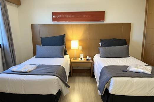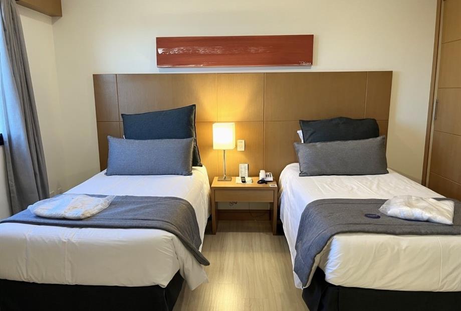 Suíte acomoda até dois adultos. - Duas camas de solteiro (tamanho 1mx2,00m); - Tomadas USB; - Ar-condicionado com controle; - Cofre digital...