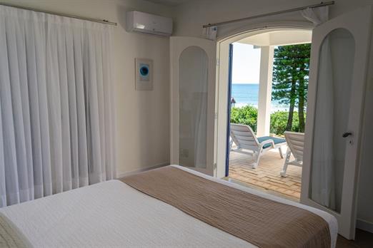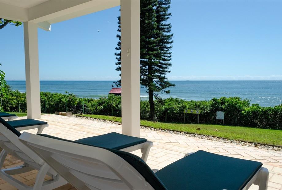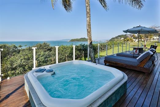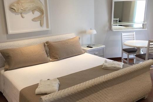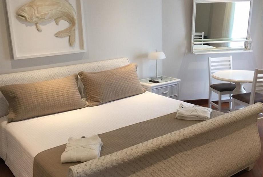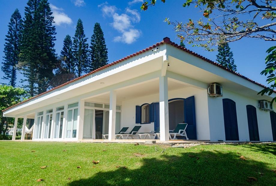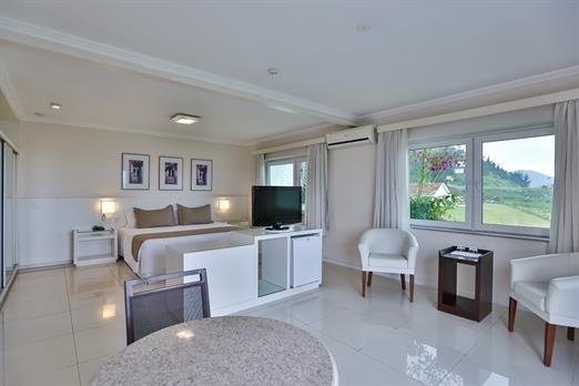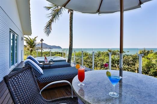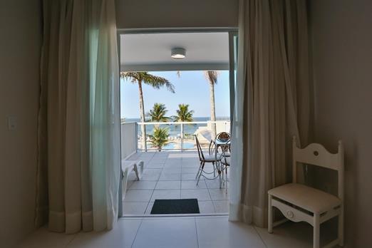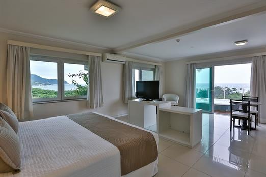 Suíte localizada em chalé com varanda e vista para o mar, possui área total de 41m², divididos entre sala de estar, quarto e banheiro. Equi...