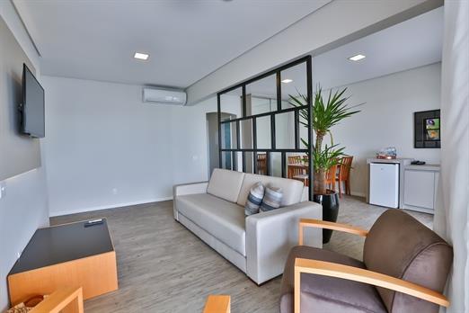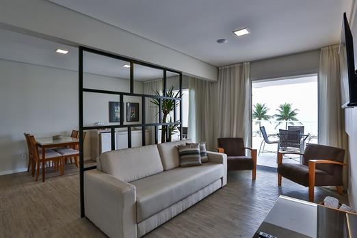 Suíte exclusiva, ampla sacada com vista parcial para o mar, possui área total de 61m², divididos entre sala de estar, quarto e banheiro. Equ...
