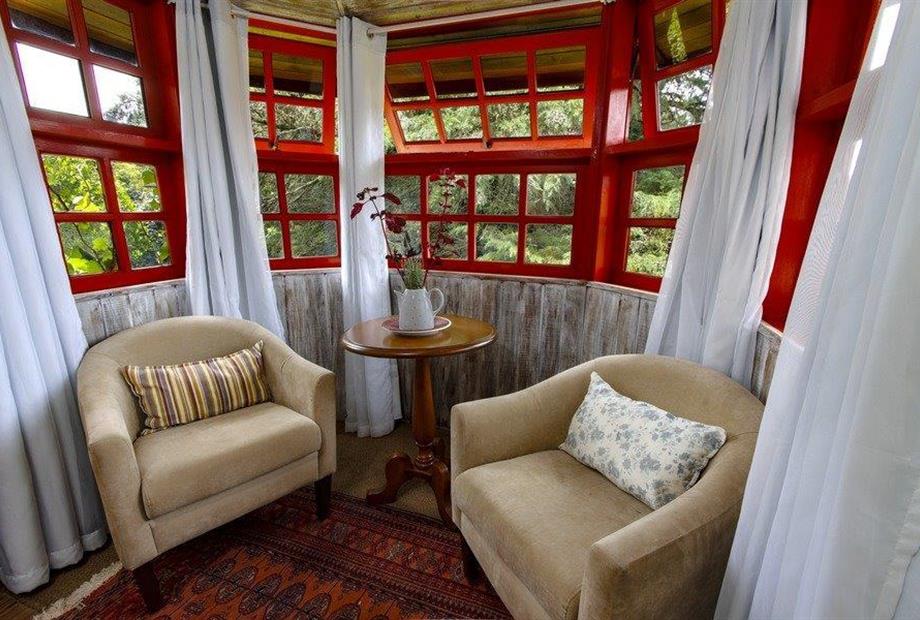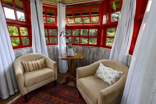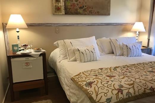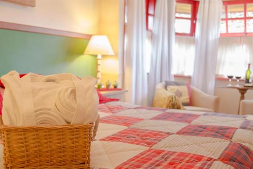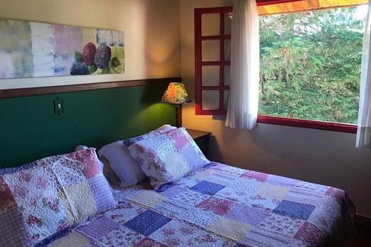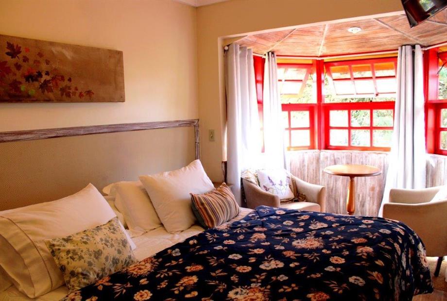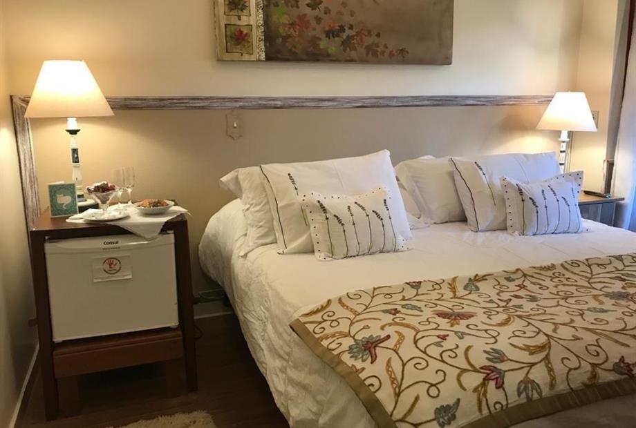 Bay window com vista para o jardim, com 1 cama king. O apartamento também conta com frigobar, Smart TV, wi-fi, aquecedor de ambiente, hidrom...