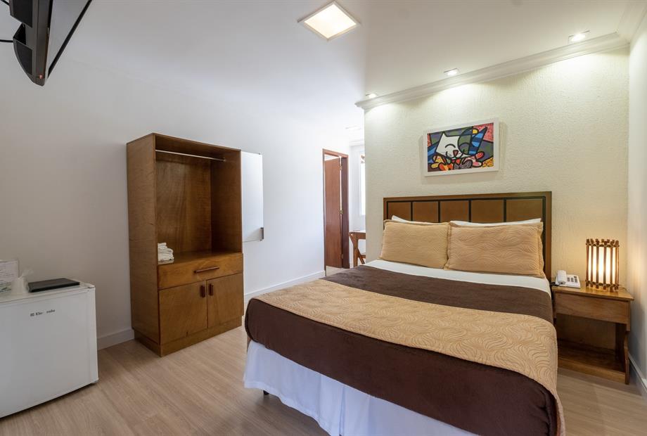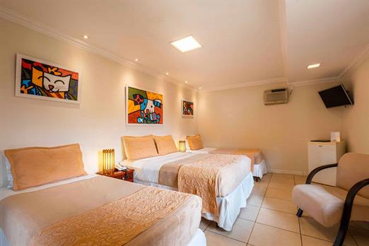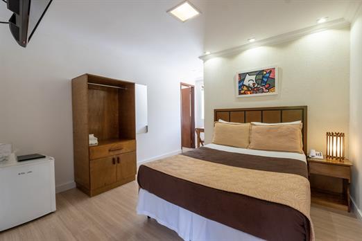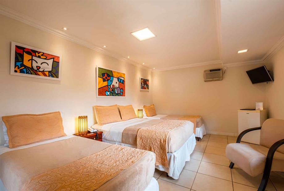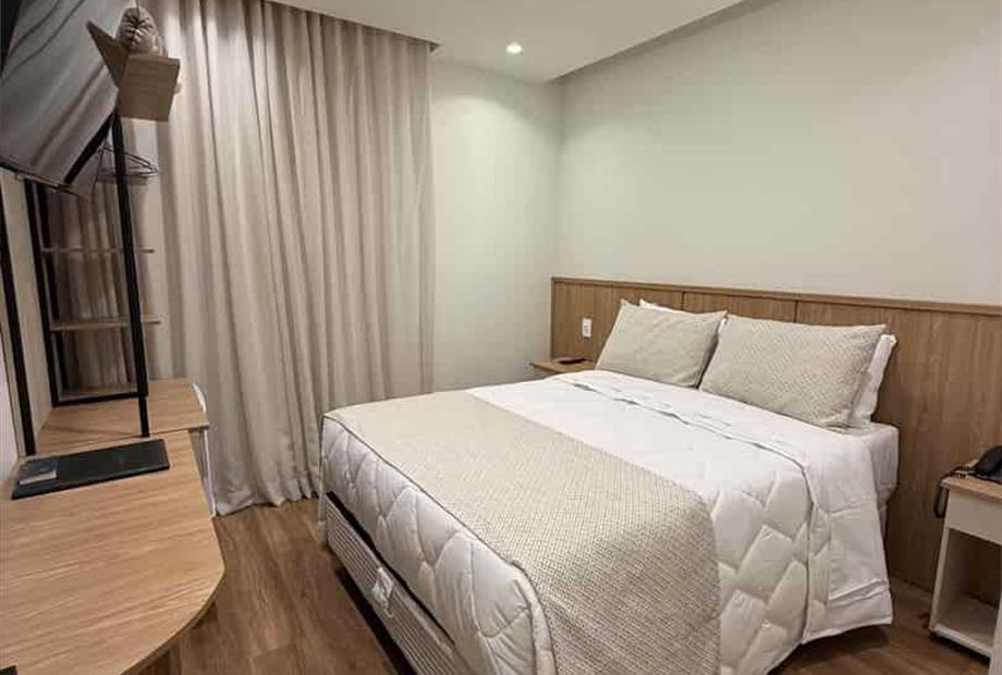 Suítes extremamente confortáveis com decoração contemporânea. Possui TV a cabo com cama box, ventilador e WI-FI.
