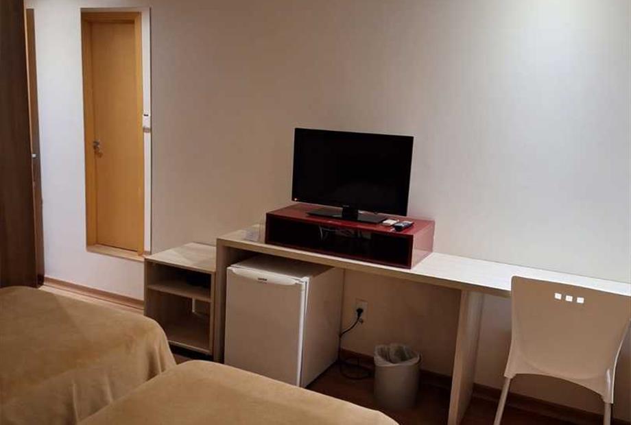 TV de LCD 32” com recepção de canais abertos e a cabo Frigobar Ar condicionado tipo Split Cofre eletrônico Sistema de aquecimento de água ce...