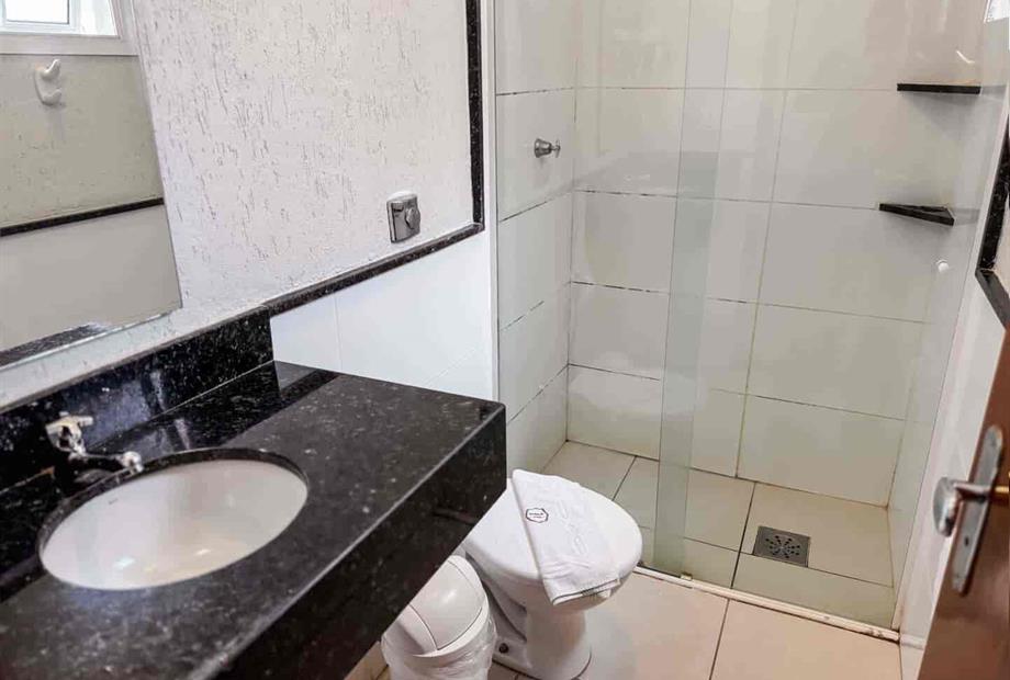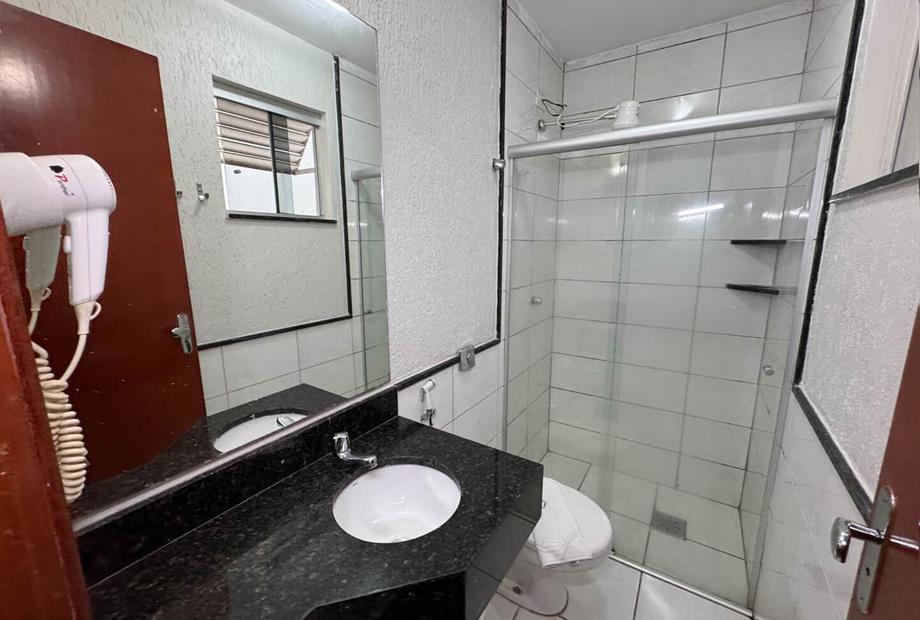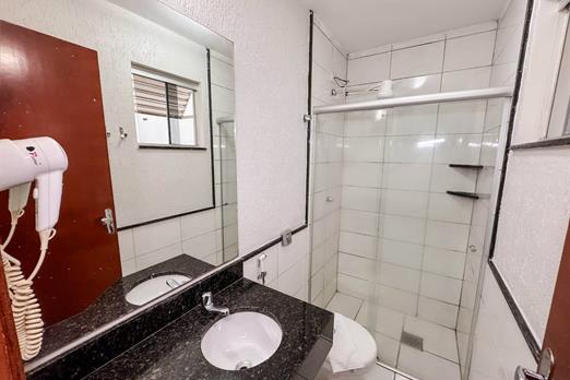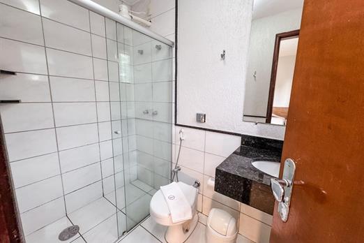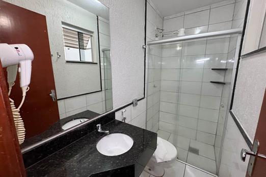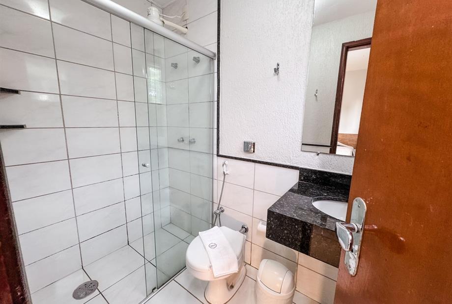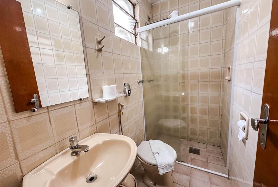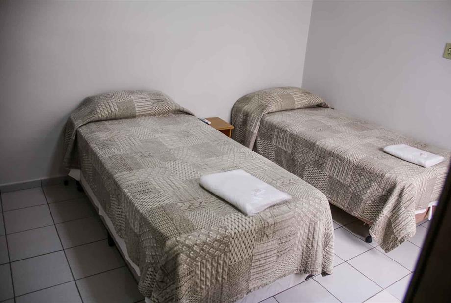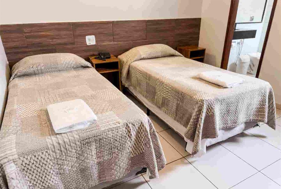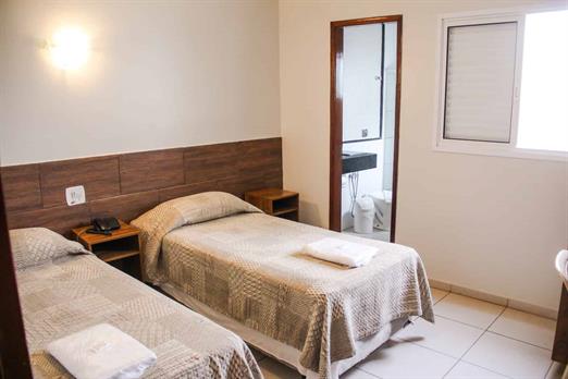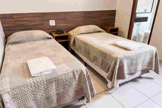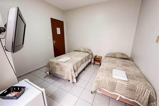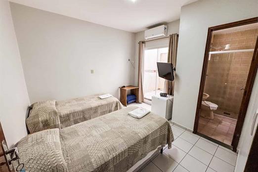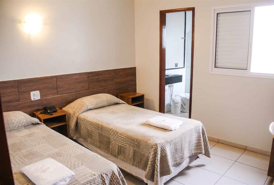 Apartamento com duas camas de solteiro, ar condicionado, tv lcd, frigobar e banheiro privativo.