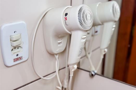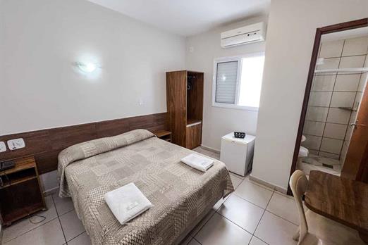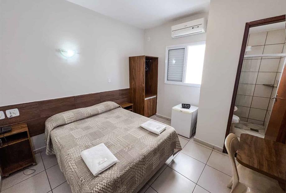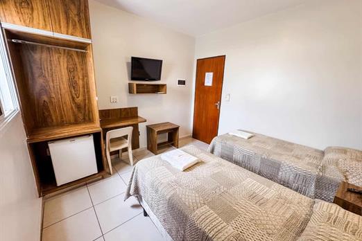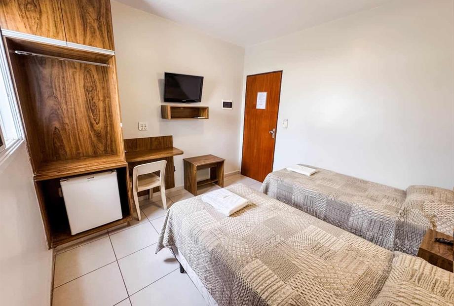 Apartamento com duas camas de solteiro, ar condicionado, mesa de trabalho, tv, frigobar, secador de cabelos e banheiro privativo.