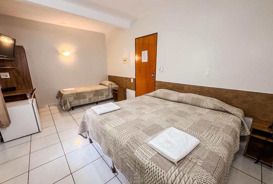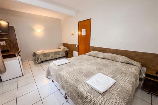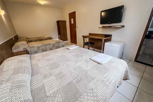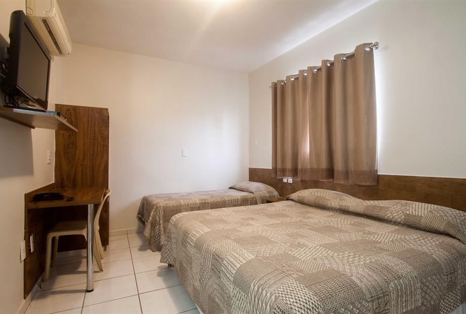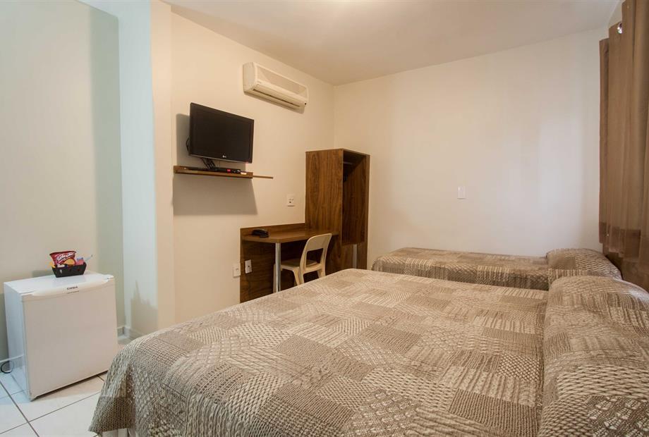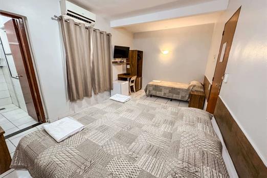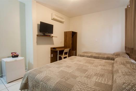 Apartamento com uma cama de casal e duas camas de solteiro, ar condicionado, mesa de trabalho, tv lcd, frigobar, secador de cabelos e banhei...
